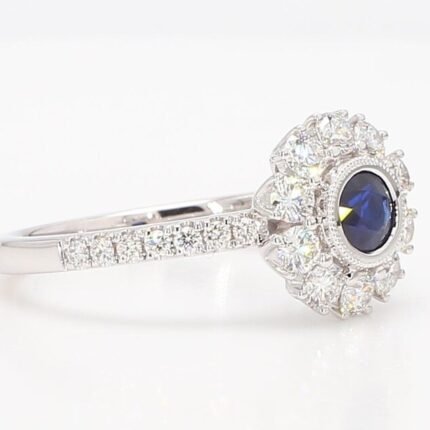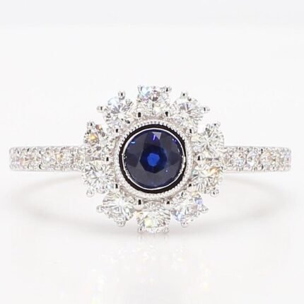 18K Solid Gold Blue Round Sapphire & Lab Grown Diamond 1.00 Carat Ring