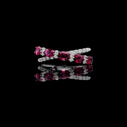 1.61ct 18K gold wedding band with oval red rubies and lab-grown white diamonds. IGI certified, VS1 clarity, BIS hallmarked. Elegant and timeless.