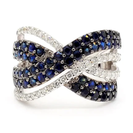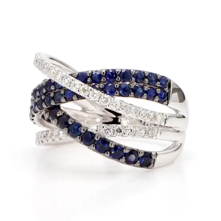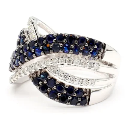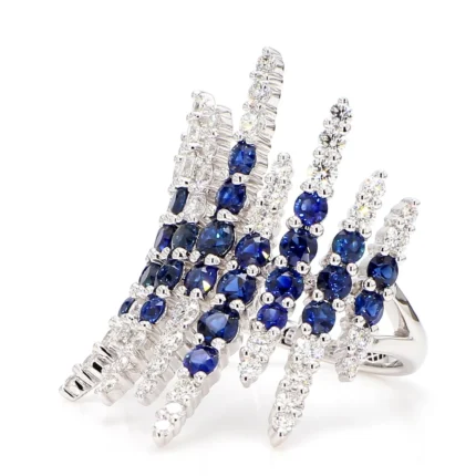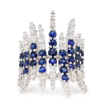 A captivating 18K gold cocktail ring featuring round blue sapphires and sparkling lab grown white diamonds. Certified for elegance and excellence.