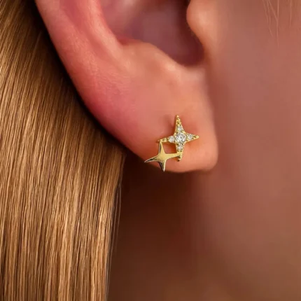 Chic 18K gold double star stud earrings with 0.10ct Lab Grown diamonds. IGI certified, everyday sparkle with celestial charm.