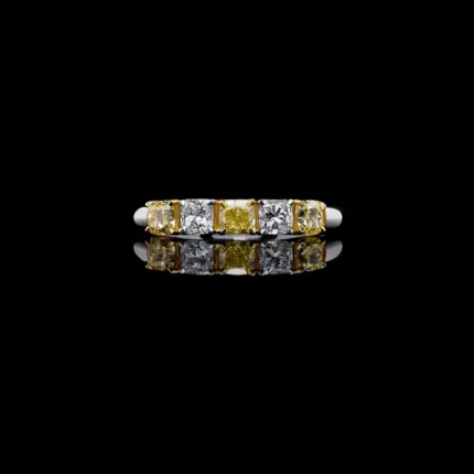 A vibrant 1.53 carat cocktail band featuring cushion-cut yellow diamonds and Asscher-cut white diamonds, elegantly set in 18K solid gold.
