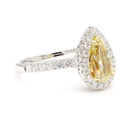 Crafted in 18K solid gold, this 1.69ct cocktail ring features a captivating 1.13ct pear-cut light yellow lab grown diamond, accented by round white diamonds. IGI certified and ethically sourced brilliance.