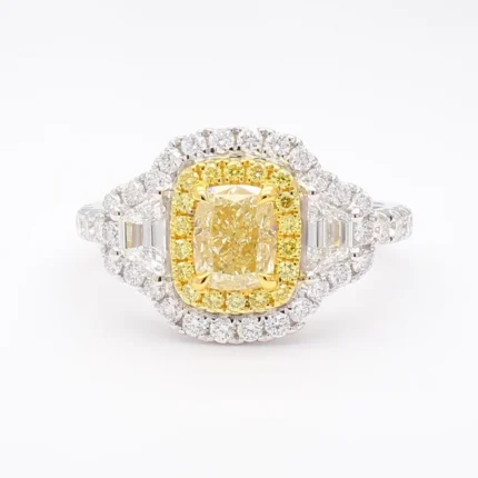 A 2.13ct 18K gold cocktail ring featuring a vivid 1.01ct cushion-cut yellow lab diamond, flanked by trapezoid-cut white diamonds and round yellow and white accents.