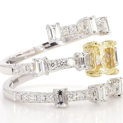 A luxurious 2.24ct cocktail ring crafted in 18K solid gold, showcasing a 1.00ct cushion-cut yellow lab grown diamond, framed by white and yellow accent stones. Ethically sourced and IGI certified.