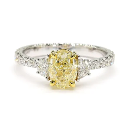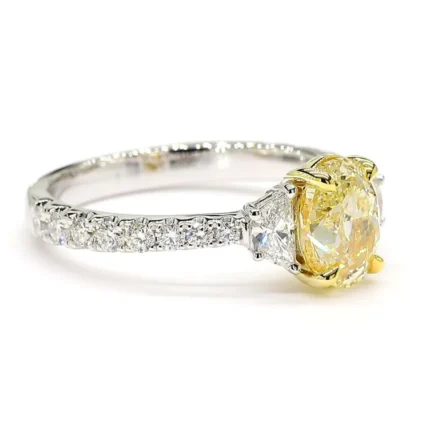 This 18K solid gold cocktail ring features a stunning 1.50ct oval-cut light yellow lab grown diamond, accented with white half-moon and round diamonds—certified for brilliance and ethical craftsmanship.