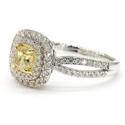 0.99ct cushion yellow lab grown diamond ring with white accents in 18K gold. Certified, radiant, and ethically crafted for timeless glamour.
