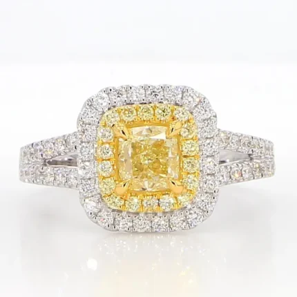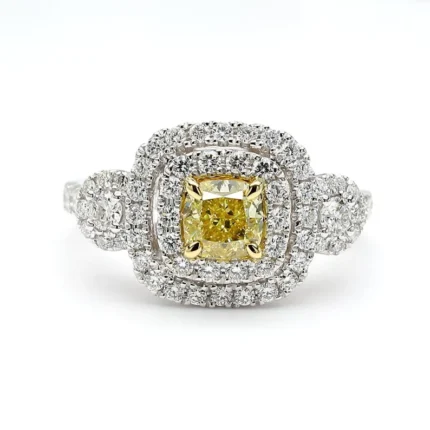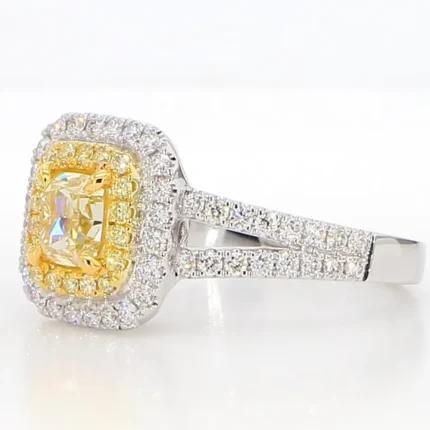 A radiant 1.42 carat cocktail ring showcasing a cushion-cut yellow lab grown diamond with sparkling yellow and white accents in 18K solid gold.
