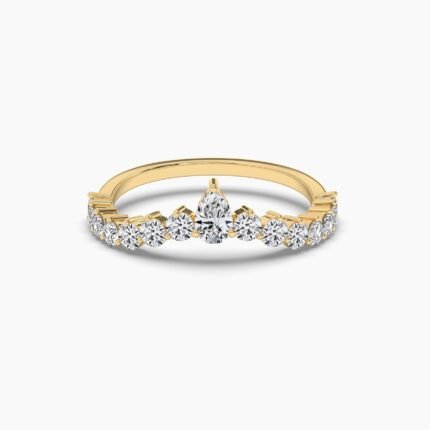 Elegant 18K gold curved wedding band with 0.68ct GIA-certified natural diamonds in round and pear cuts. BIS hallmarked for gold purity.