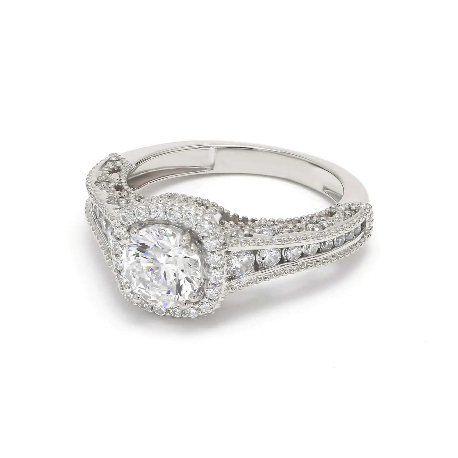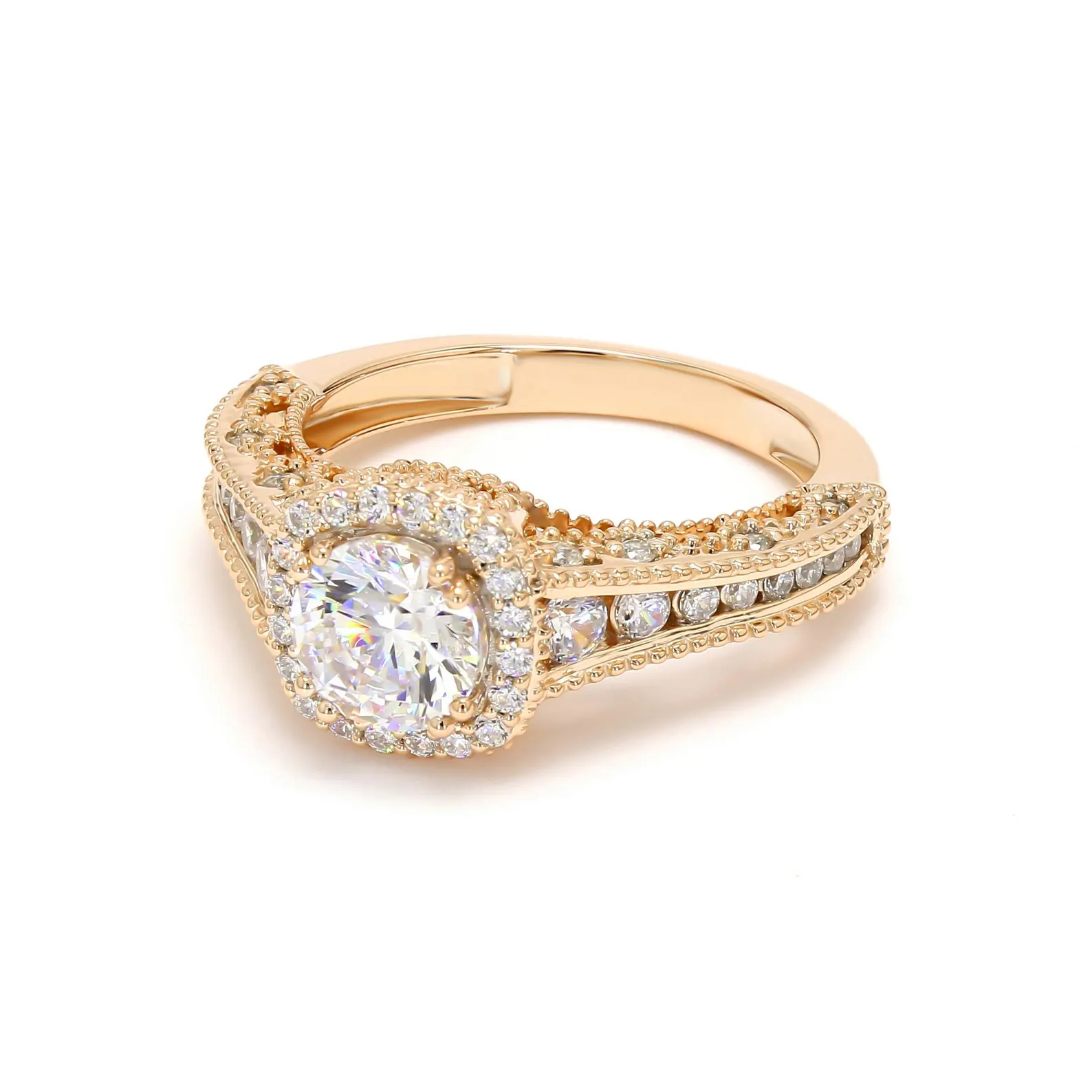 Crafted in 18K solid gold, this engagement ring is a true statement of elegance and durability. Its halo setting adds both volume and sparkle, making the center diamond appear even more captivating. With H color and SI1 clarity, every diamond in this ring is hand-selected for exceptional beauty and brilliance.