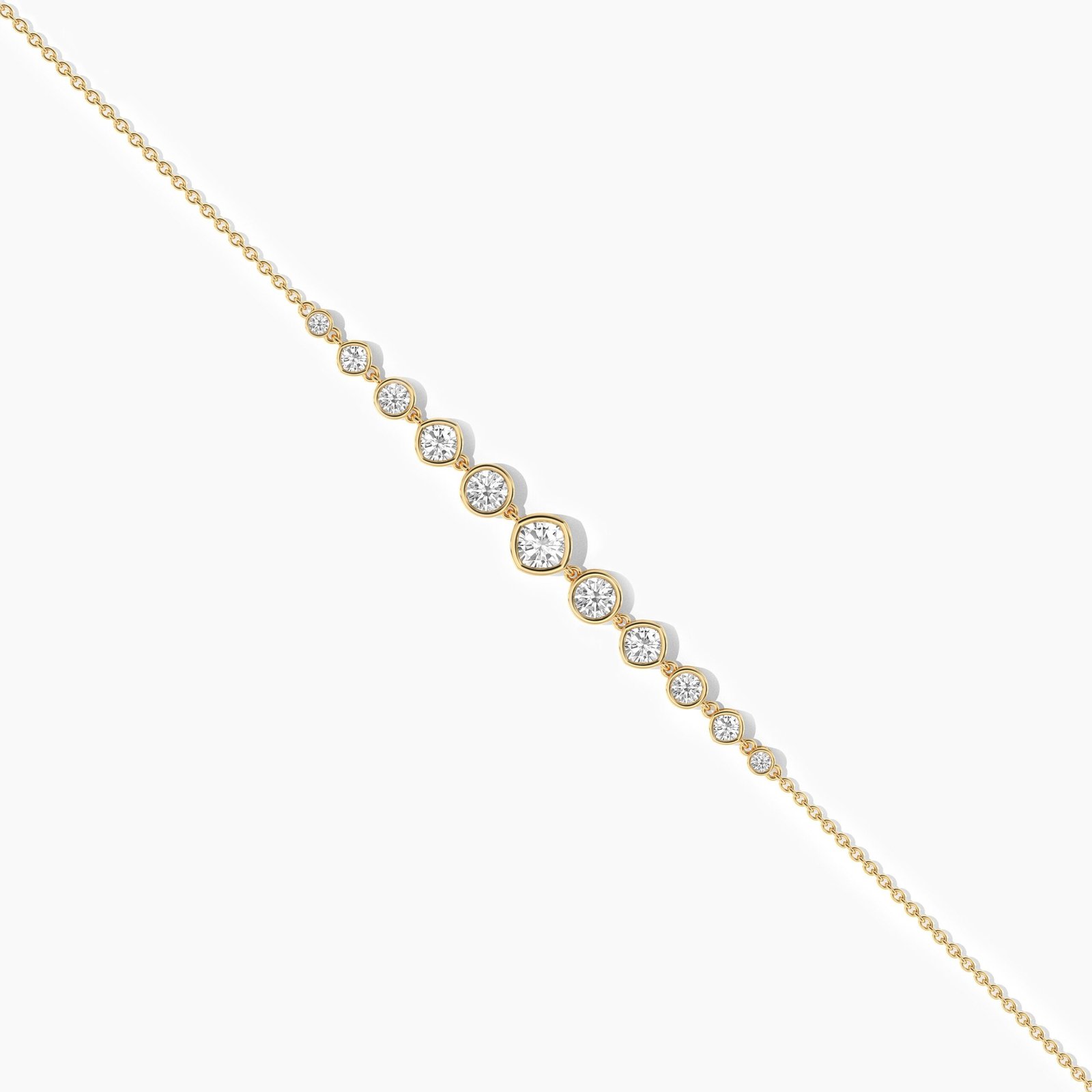 Add a touch of refined sophistication to your jewelry collection with our 14K Solid Gold Lab Grown Diamond Bracelet, featuring 9 beautifully graduated diamonds in an elegant bezel setting. The mix of cushion and round cuts in varying sizes creates a harmonious, eye-catching design that flows gracefully along the wrist.