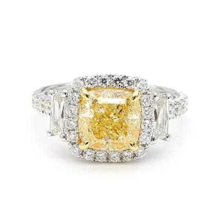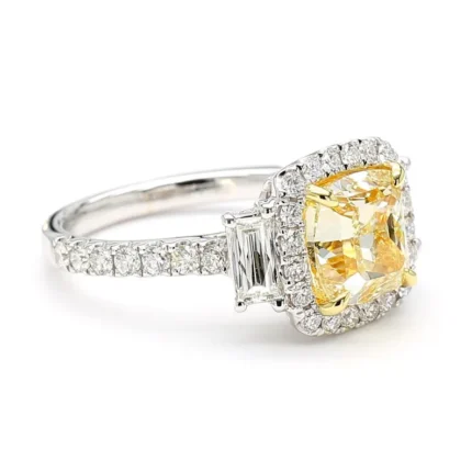 A radiant 3.40ct 18K gold cocktail ring with a 2.46ct light yellow cushion-cut lab-grown diamond, framed by white trapezoid and round diamonds.