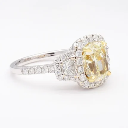 A radiant 3.40ct 18K gold cocktail ring with a 2.46ct light yellow cushion-cut lab-grown diamond, framed by white trapezoid and round diamonds.