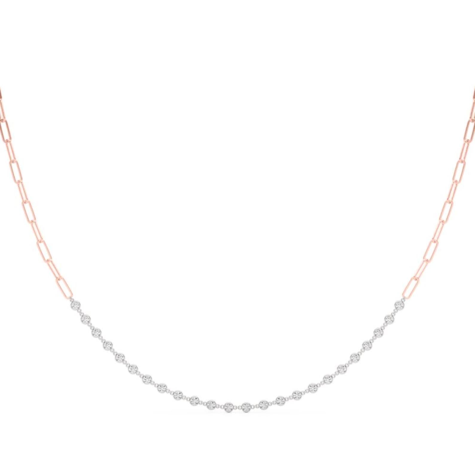 Modern 18K gold paperclip chain necklace with 0.75ct natural round diamonds in bezel settings. IGI certified, stylish, and stackable.