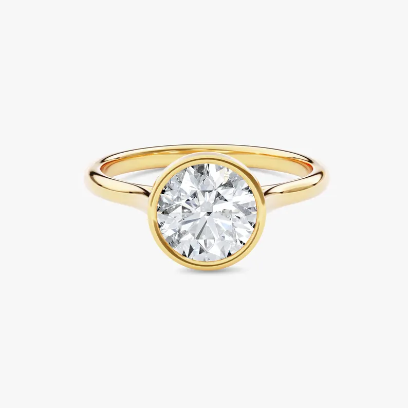 1.00ct round cut Lab Grown diamond bezel engagement ring in 18K solid gold. IGI Certified for timeless brilliance.