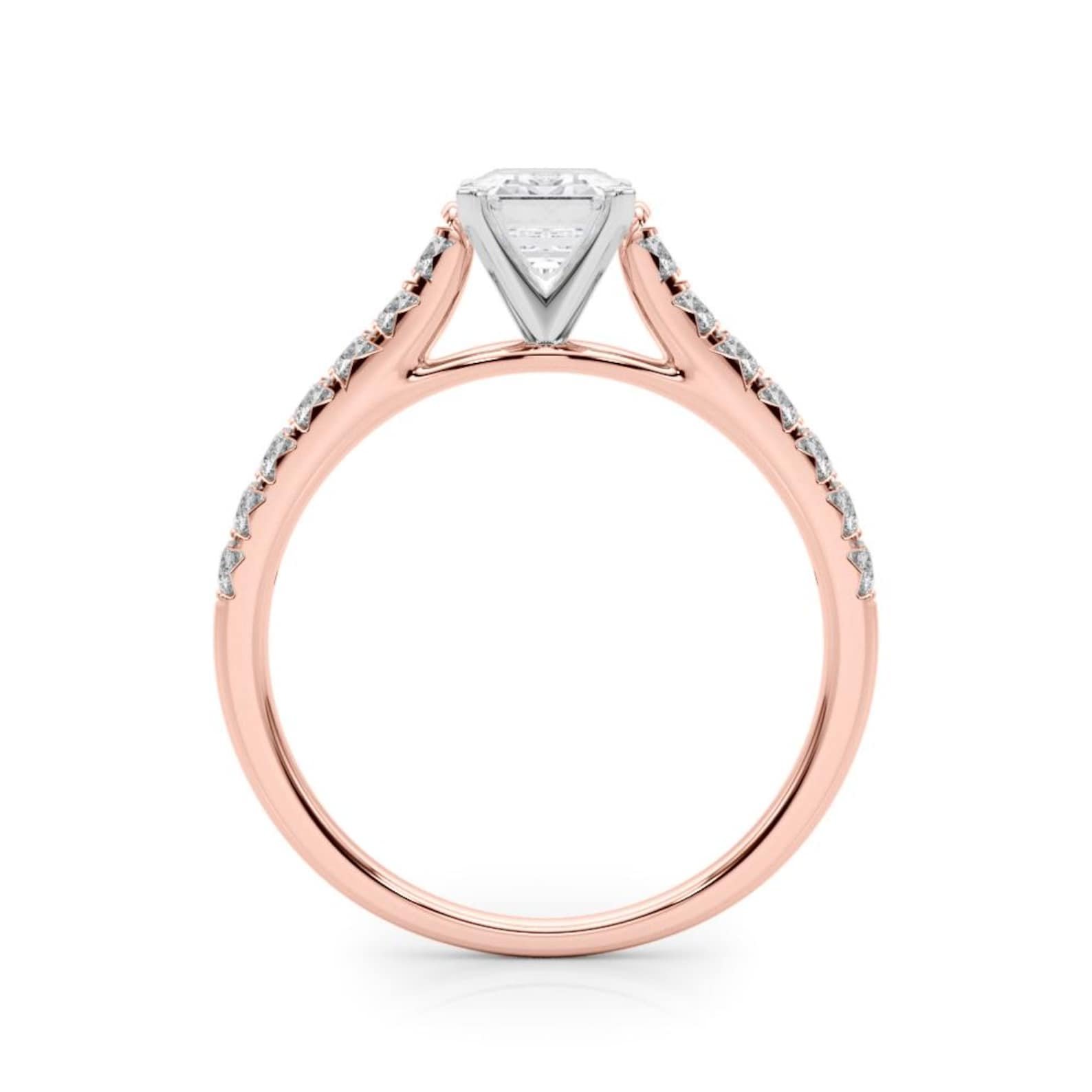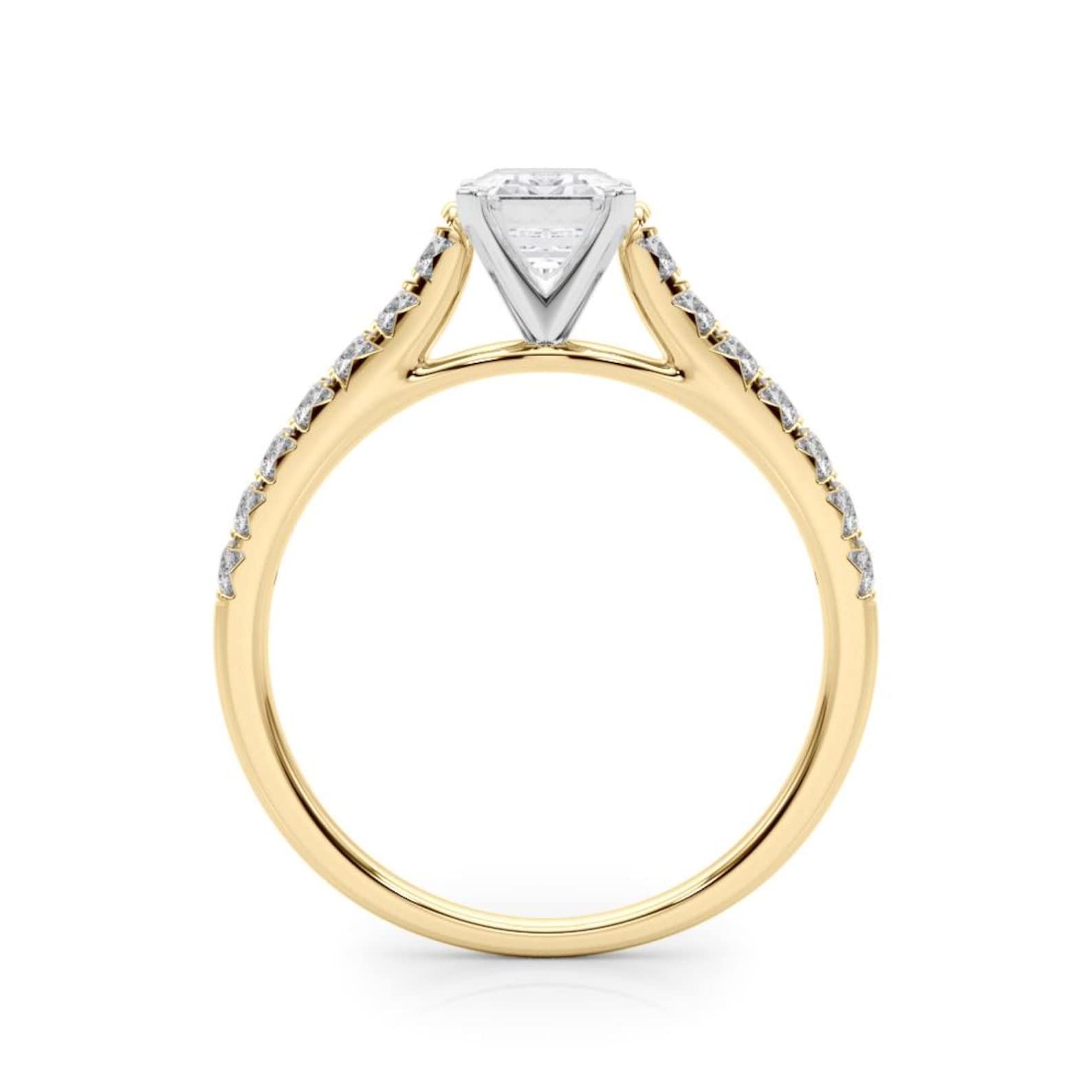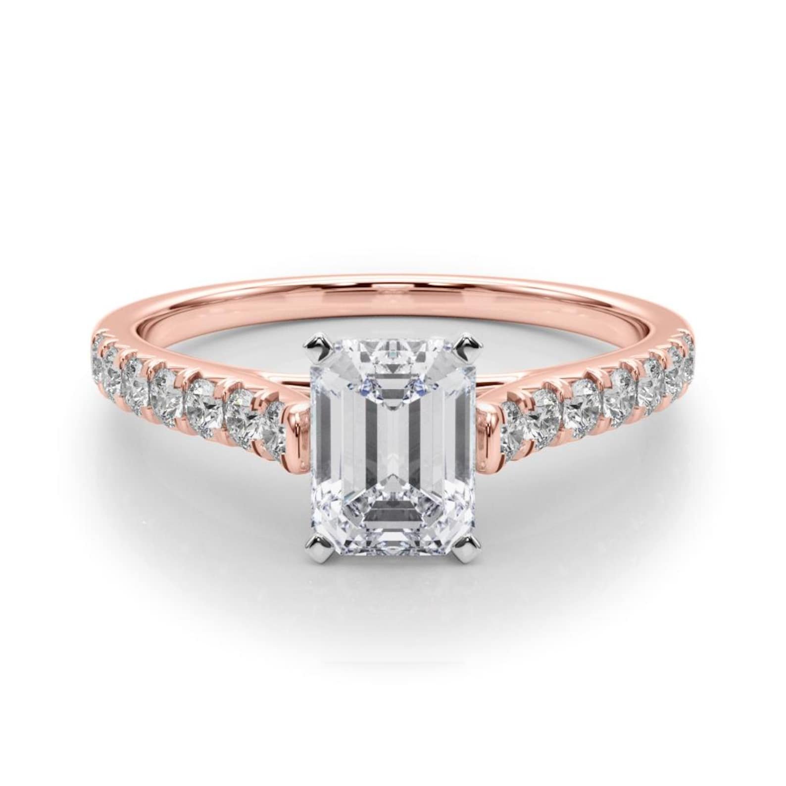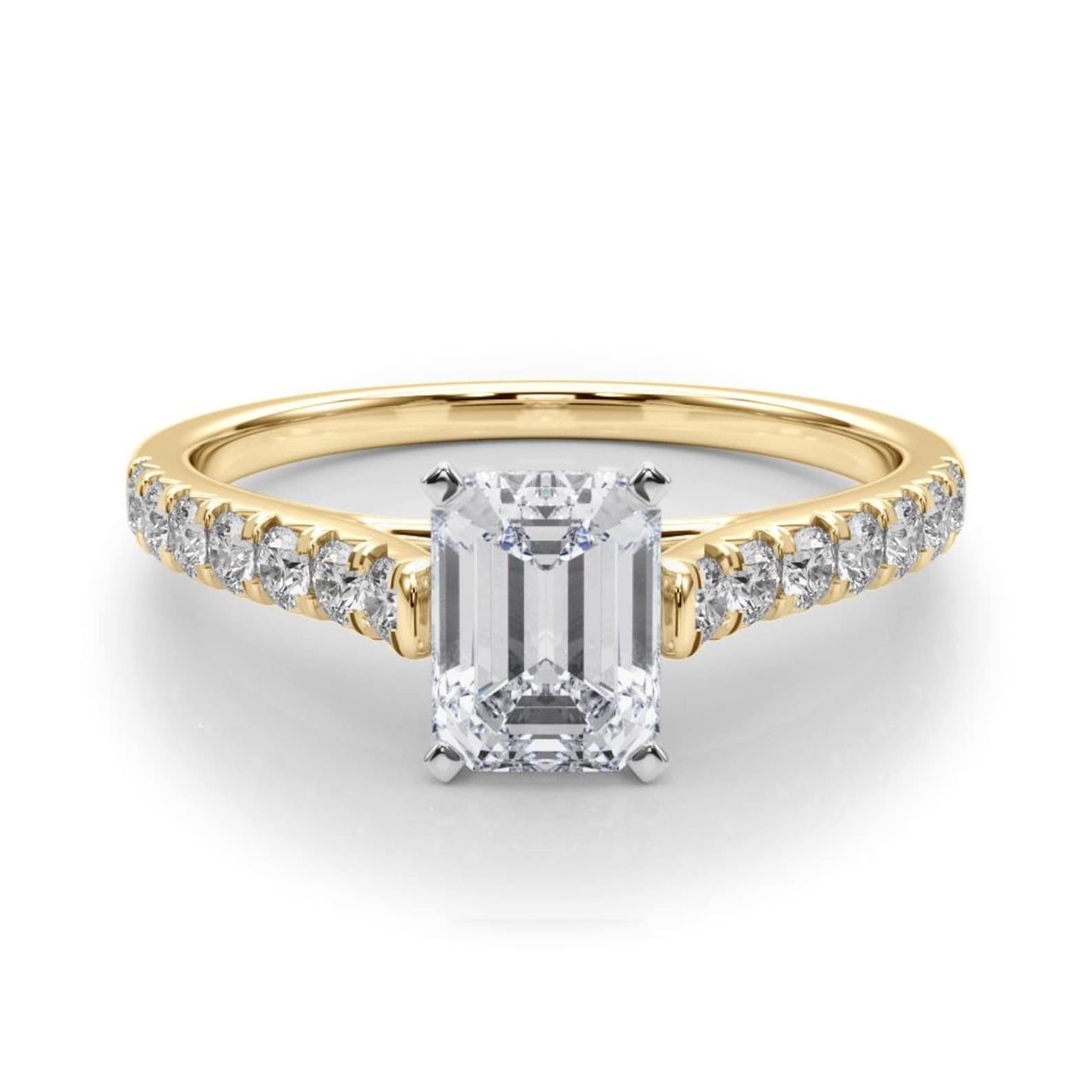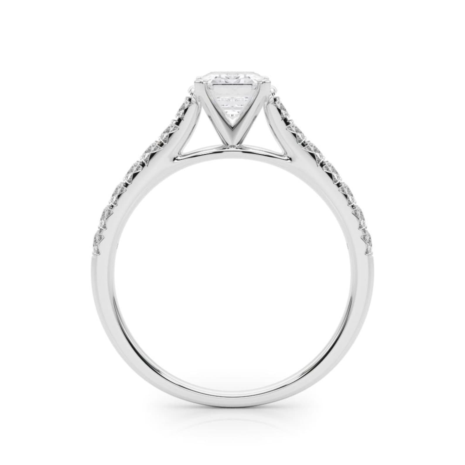 The cathedral setting elevates the center stone gracefully, allowing light to enter from all angles and enhancing the diamond’s natural brilliance. The crisp lines of the emerald cut add a modern sophistication, while the pavé diamonds along the shank lend additional sparkle and luxury.