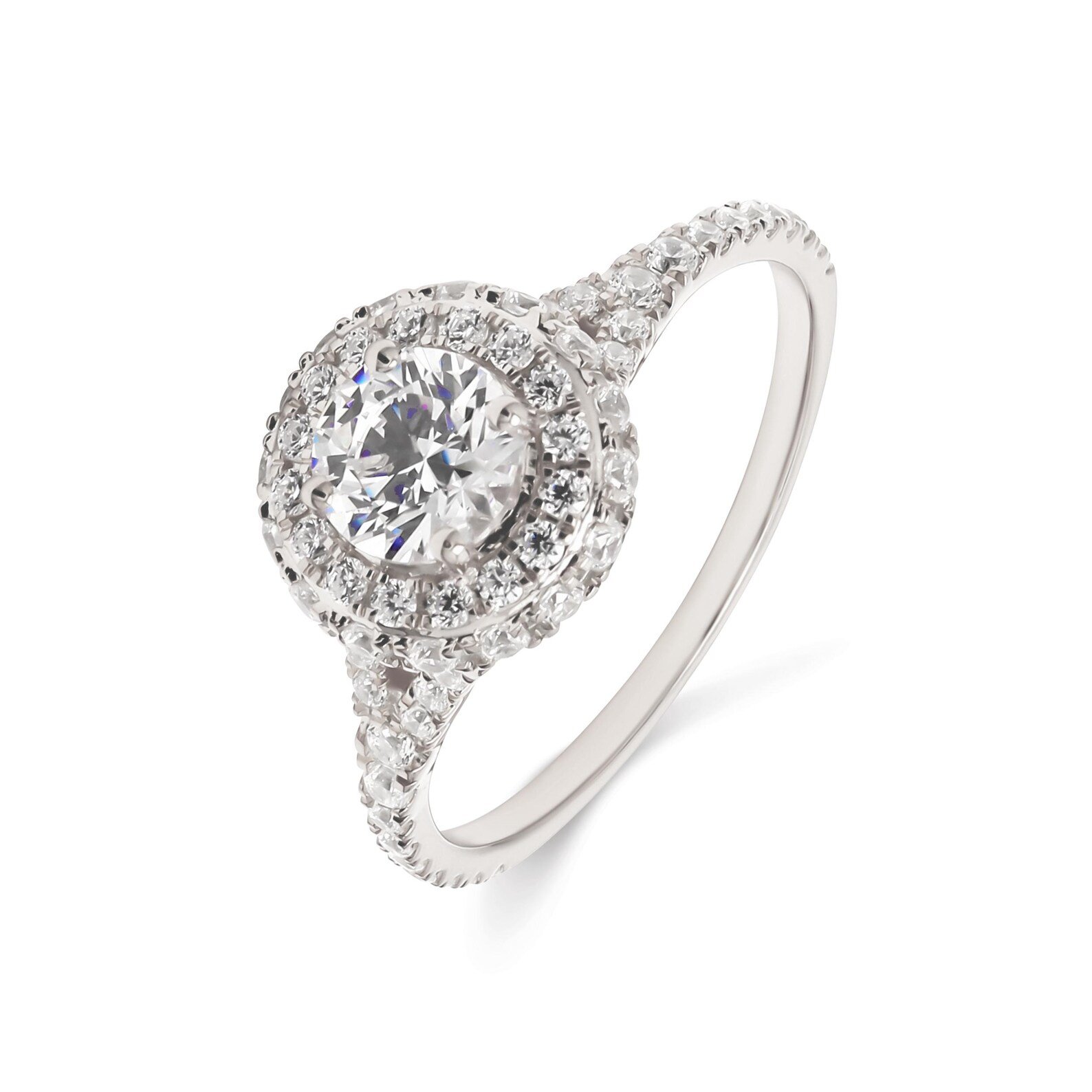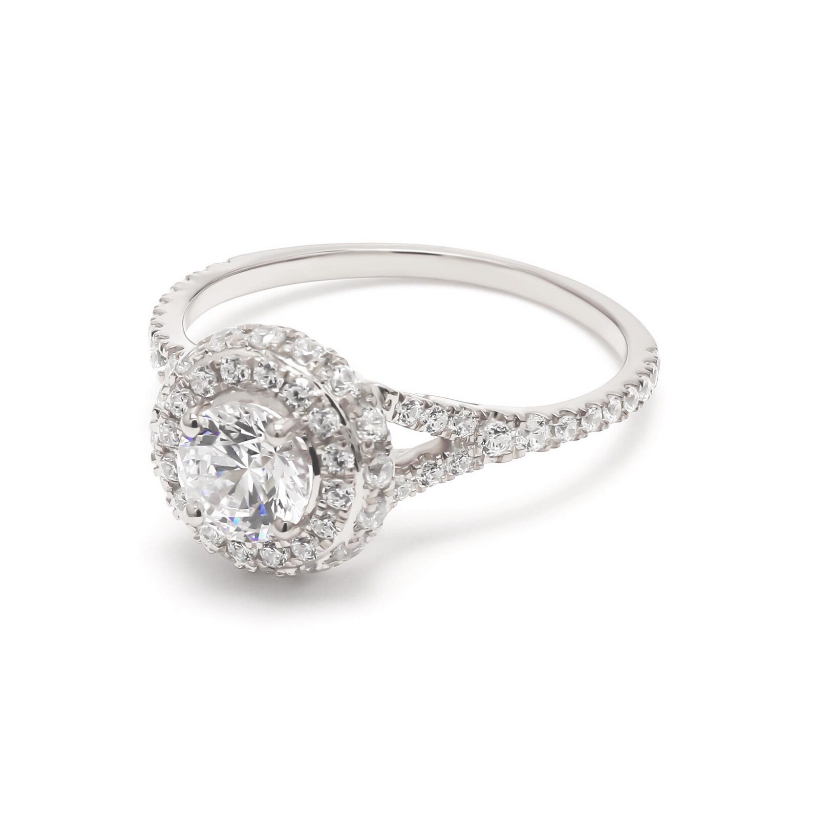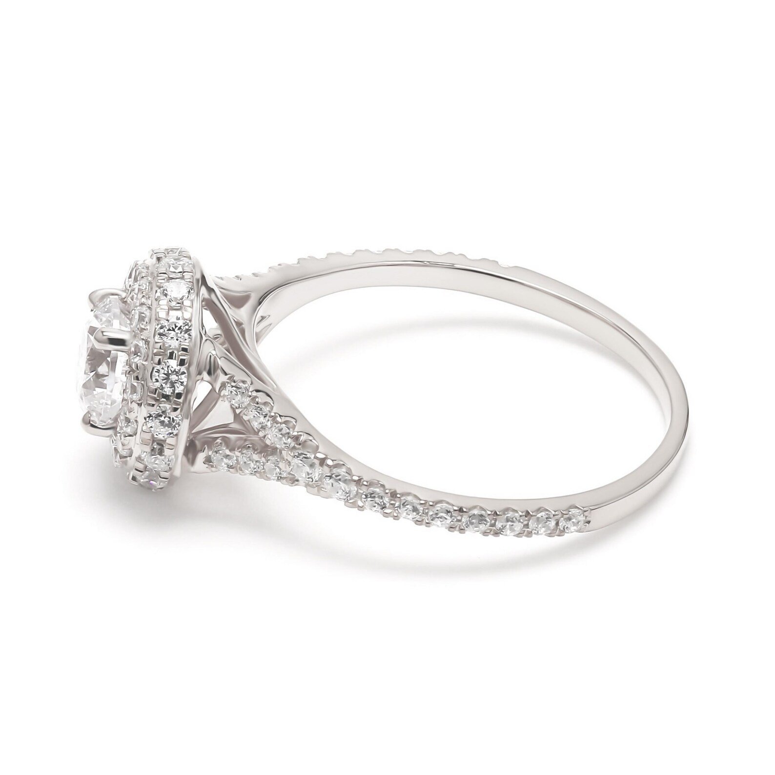 Encircling the center stone are two concentric halos of pavé-set diamonds, creating an amplified brilliance that makes the centerpiece appear larger and more luminous. Additional pavé diamonds along the shank add extra sparkle, ensuring this ring dazzles with every movement.