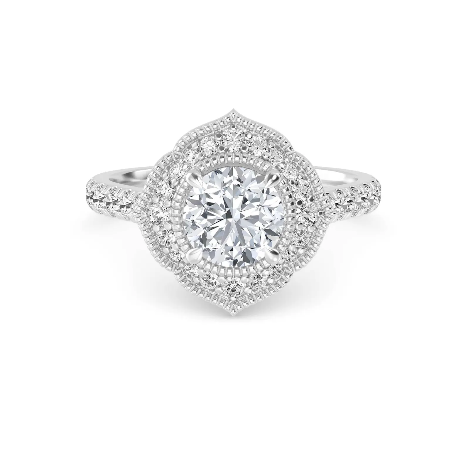 At its heart lies a 1.00 carat round brilliant cut Lab Grown diamond, showcasing E color and VS1 clarity—a stunning combination that radiates brilliance and fire from every angle. Surrounding the center stone, a floral-inspired halo of round diamonds adds depth, dimension, and a touch of vintage charm, amplifying the sparkle while creating an elegant, romantic silhouette.