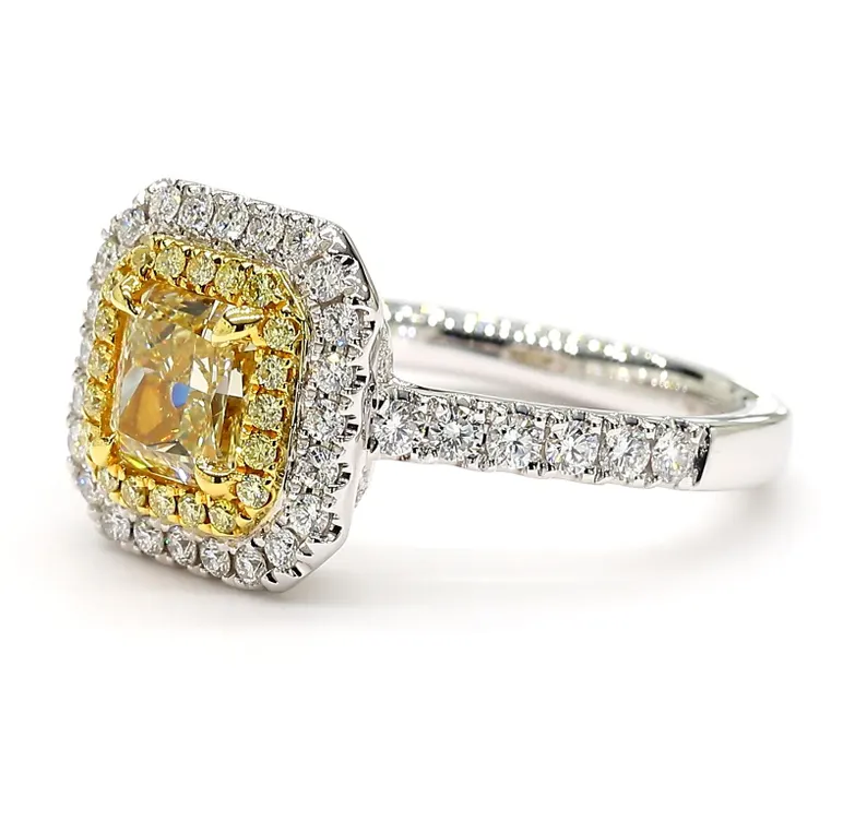 With a total weight of 1.54 carats, each diamond is graded E color and VS1 clarity, offering outstanding brilliance, fire, and clarity. The radiant cut enhances the depth and color of the yellow center stone, while the sparkling halo of white and yellow diamonds adds a luxurious finish.