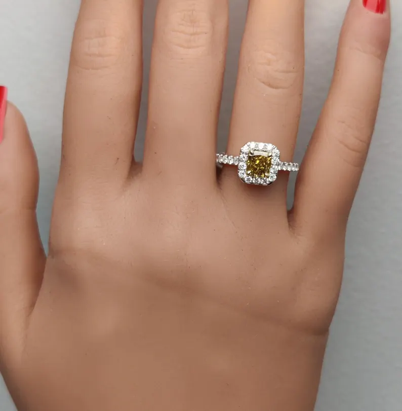 Unveil a rare and captivating allure with this 1.66 carat lab grown diamond cocktail ring, meticulously set in 18K solid gold. At its center lies a 1.00 carat radiant-cut lab grown diamond in an extraordinary Fancy Deep Brownish Greenish Yellow hue—a color that symbolizes renewal, elegance, and individuality.