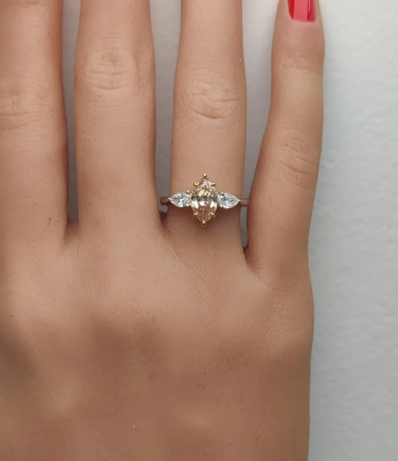 At the center shines a stunning 1.34 ct fancy brown-yellow marquise cut Natural diamond, measuring 9.65 x 5.74 x 3.81 mm, radiating warmth and sophistication. Framing the center are sparkling Natural pear cut white diamonds, meticulously set to enhance brilliance and contrast.