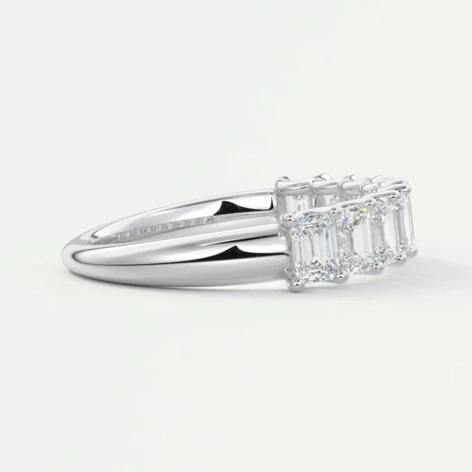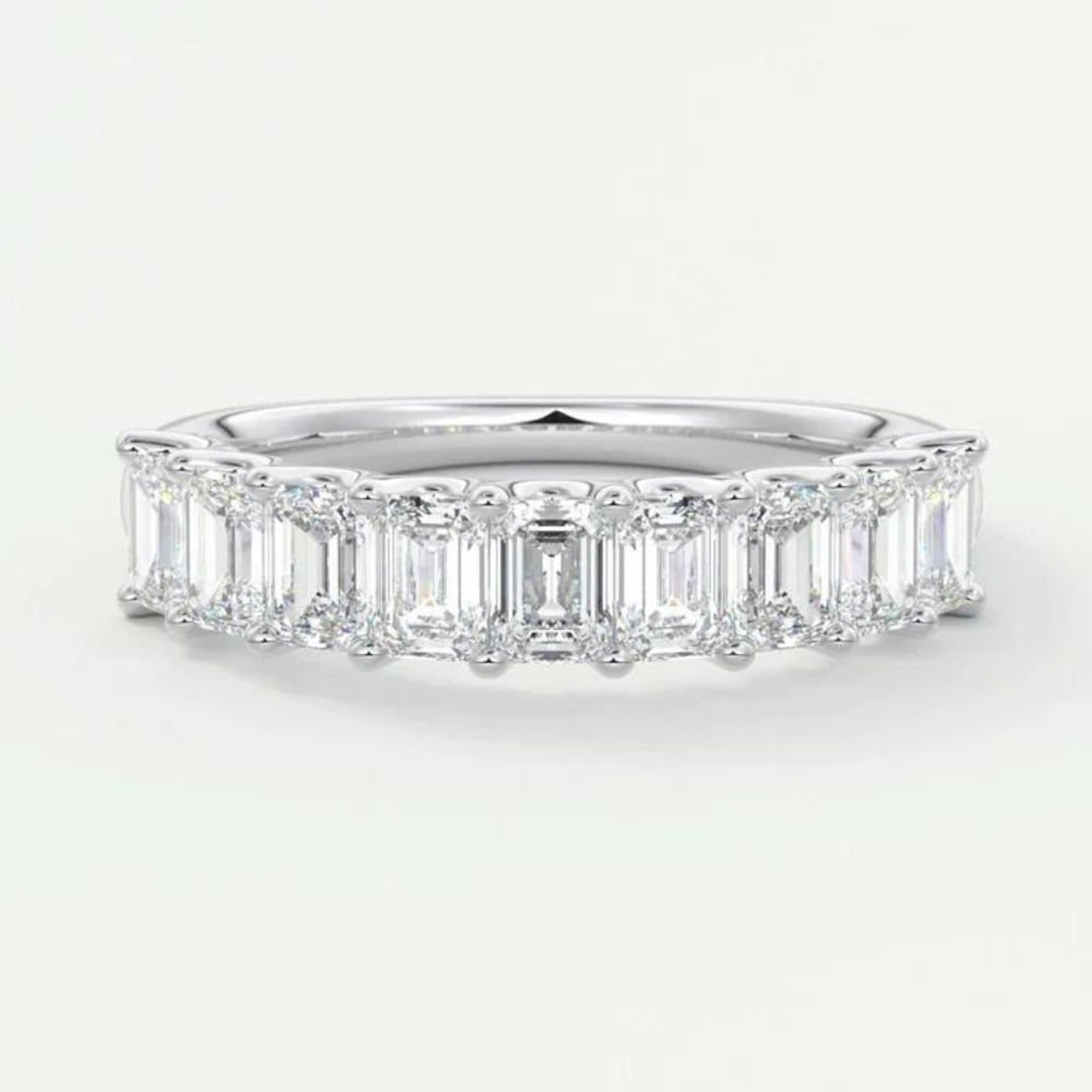 The prong setting allows each diamond to catch the light beautifully, enhancing the refined step-cut facets that emerald cuts are celebrated for. With diamonds of E color and VS1 clarity, the band ensures remarkable brilliance and purity.