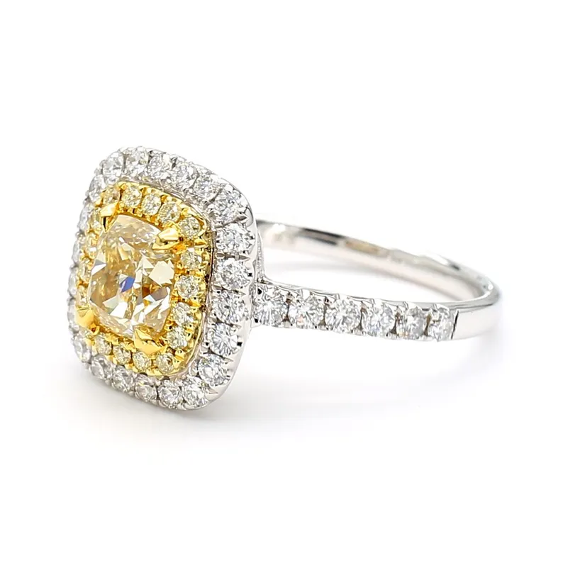 Bask in the brilliance of sunshine with this elegant 18K Solid Gold Cocktail Ring, showcasing a stunning 1.22 carat light yellow cushion-cut lab-grown diamond as its centerpiece. With dimensions of 5.92 x 5.59 x 4.15 mm, the cushion-cut gem exudes depth, clarity, and an eye-catching sparkle from every angle.