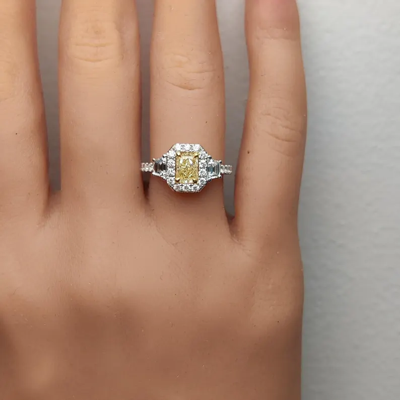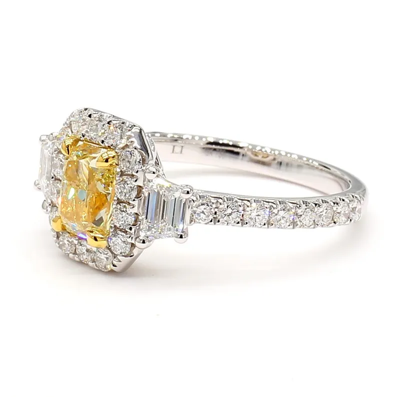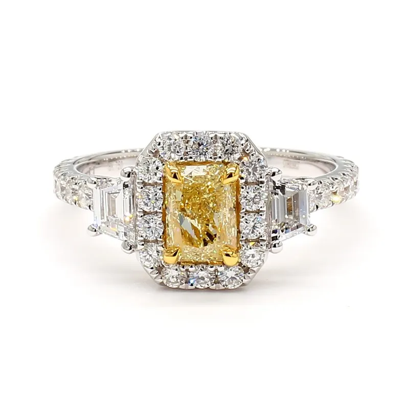 This 1.98ct radiant cut yellow lab grown diamond ring in 18K solid gold is a bold blend of color and clarity—featuring trapezoid and round white diamond accents for luxurious brilliance.