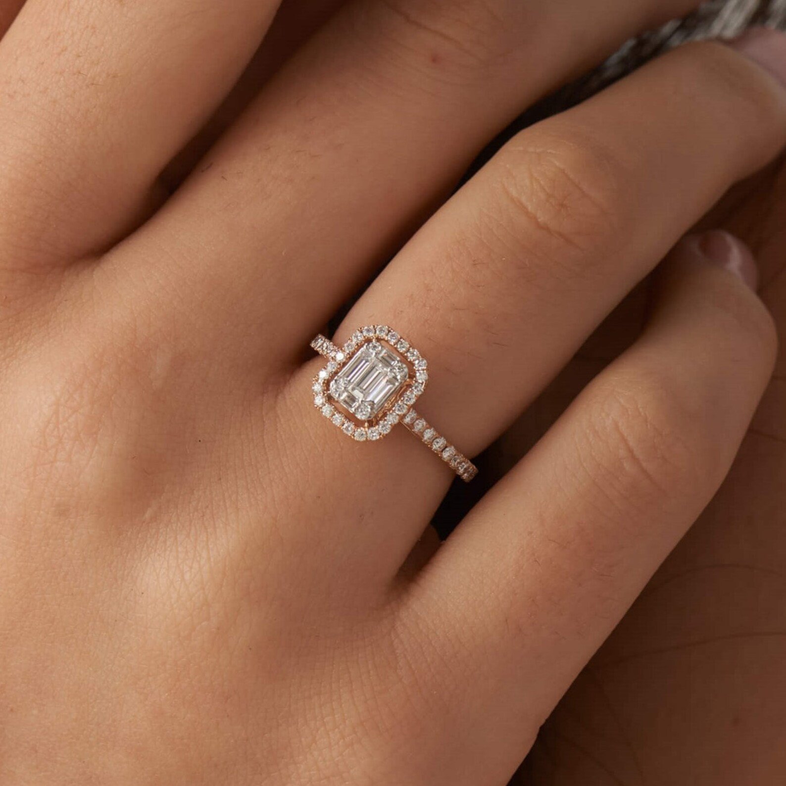 18K Solid Gold 1 CT Natural Diamond Emerald Cut Floating Halo Engagement Ring