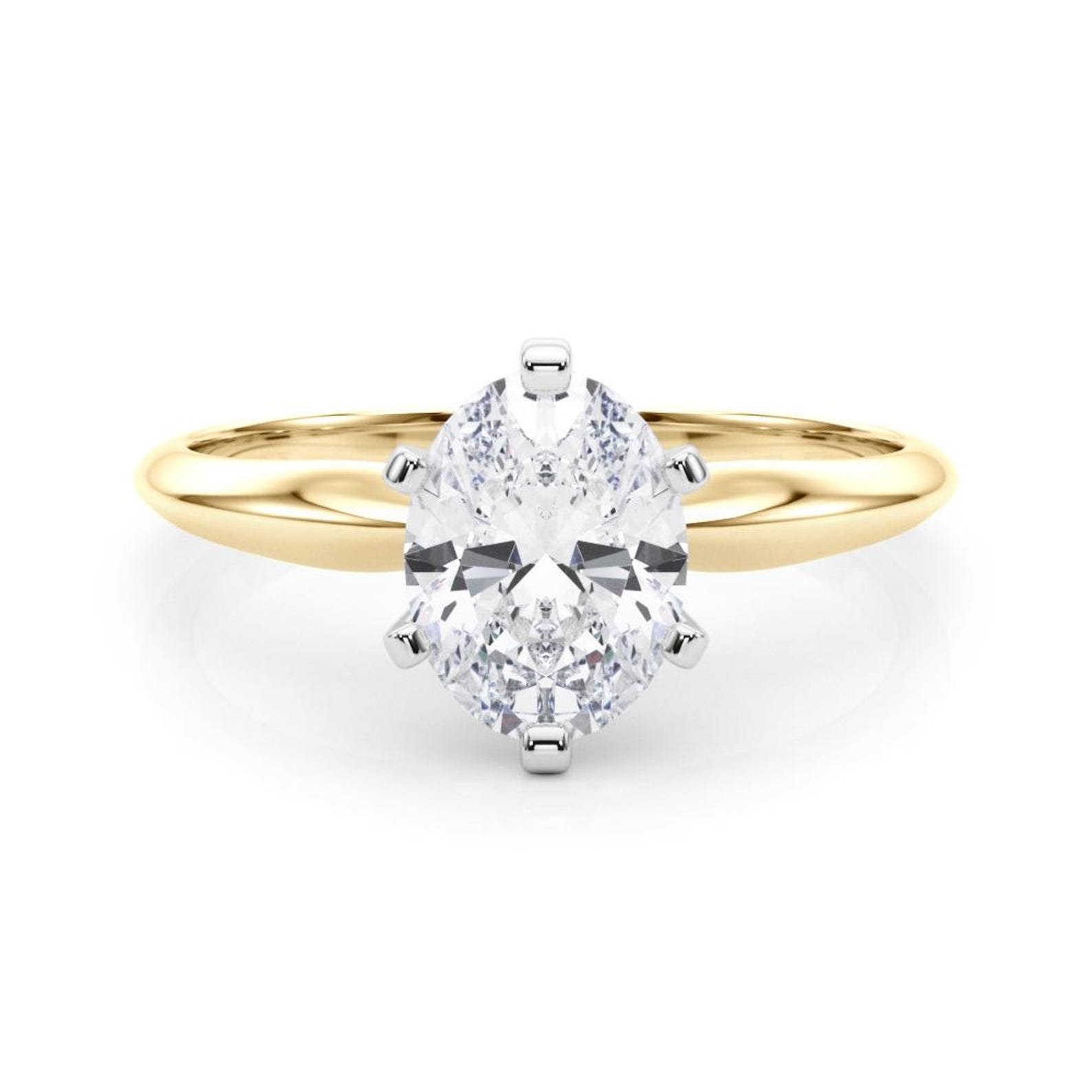18K solid gold solitaire engagement ring featuring a 1CT oval-cut natural diamond in a 6-prong setting. H/SI1 quality, GIA certified.