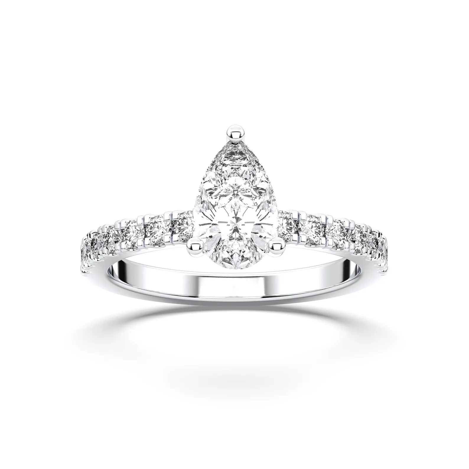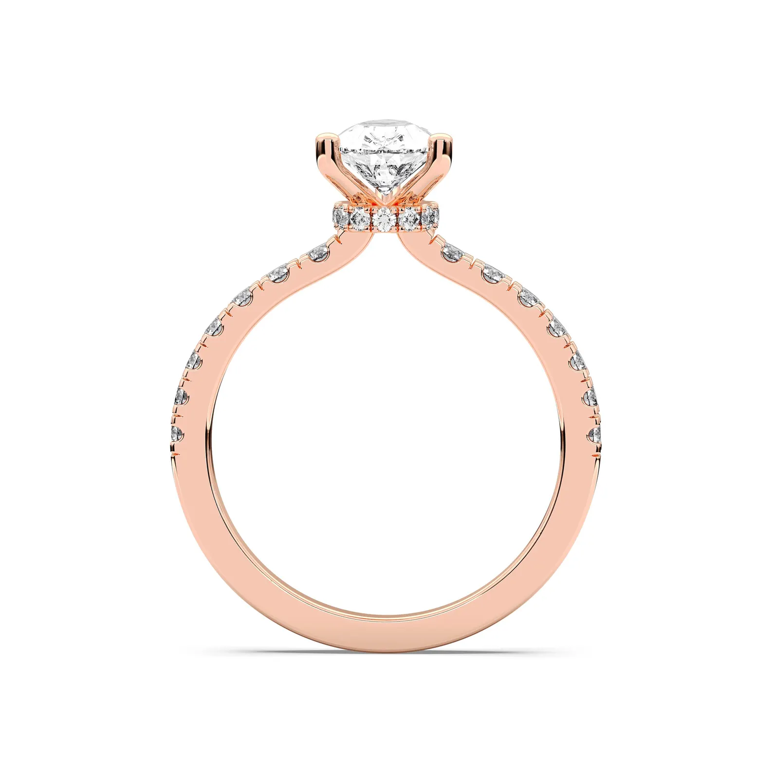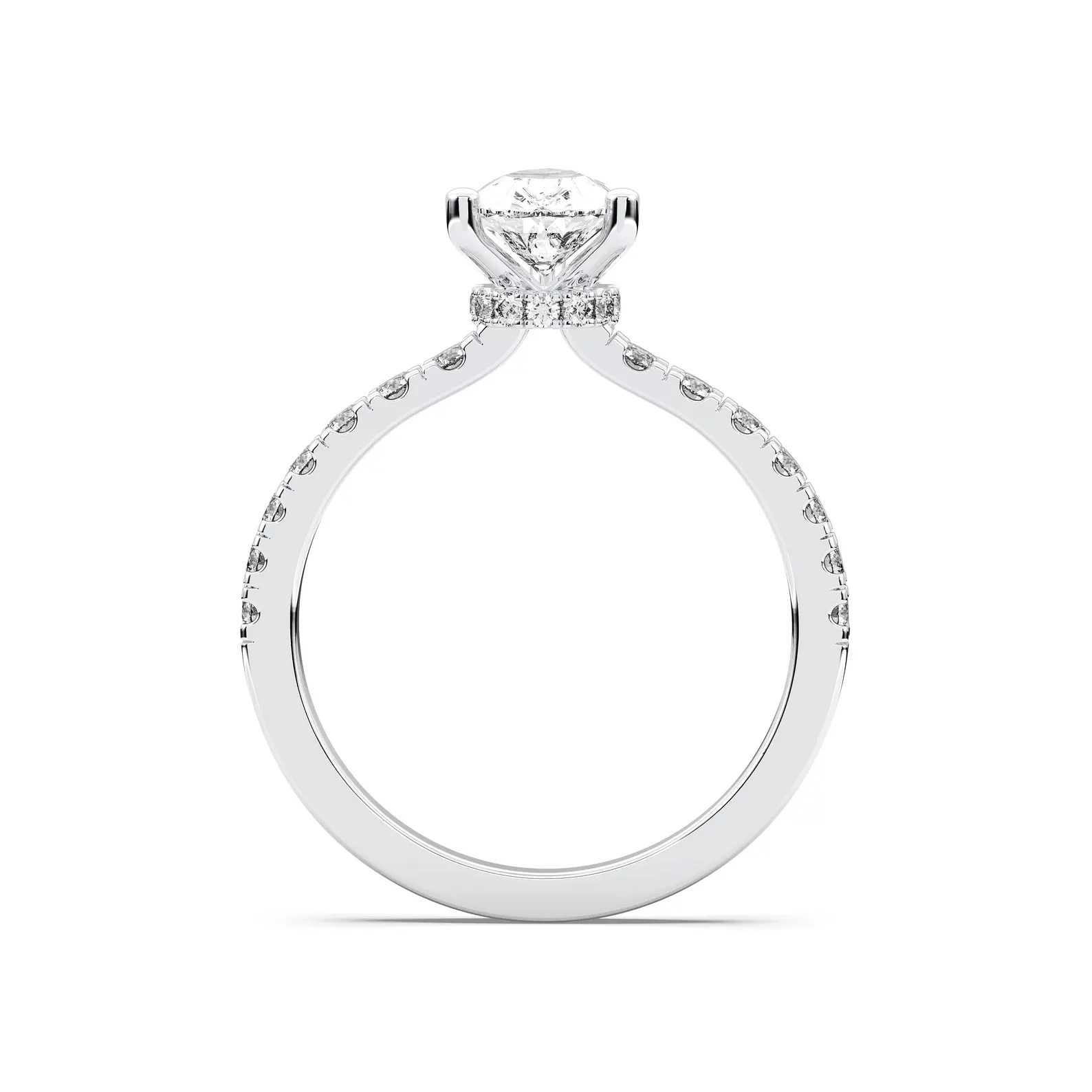 Surrounding the center stone is a halo of sparkling diamonds, amplifying its size and luminosity. The pavé-set band enhances the overall brilliance, creating a seamless flow of light with every movement. The pear cut, also known as the “teardrop diamond,” is cherished for its romantic silhouette, combining the brilliance of a round cut with the elongation of a marquise.