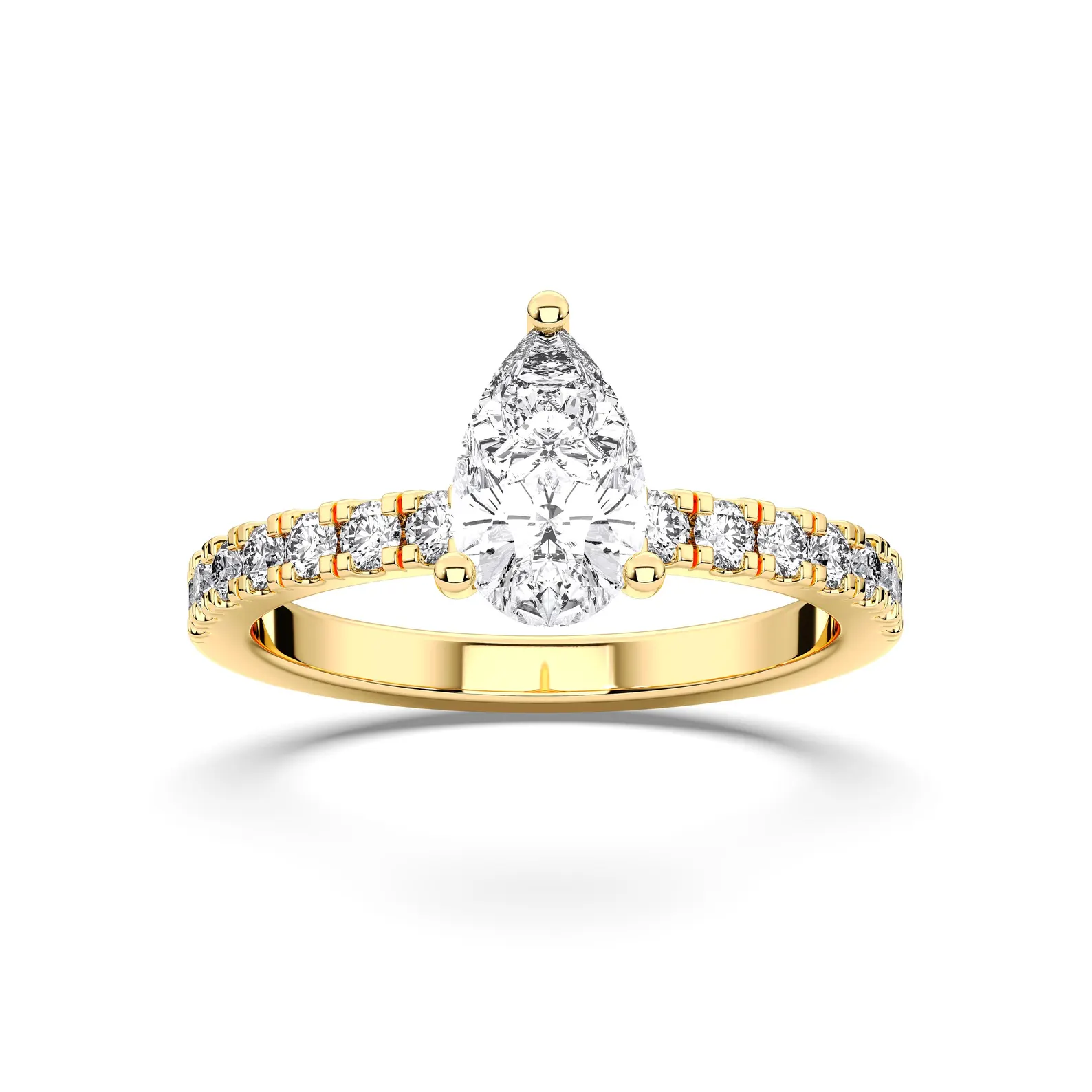 Graceful and radiant, this 1 CT Pear Cut Lab Grown Diamond Engagement Ring in 18K solid gold is a symbol of elegance and love. The center stone features a dazzling pear-shaped Lab Grown diamond, weighing 1 carat, with exceptional E color and VS1 clarity for unmatched brilliance and fire.