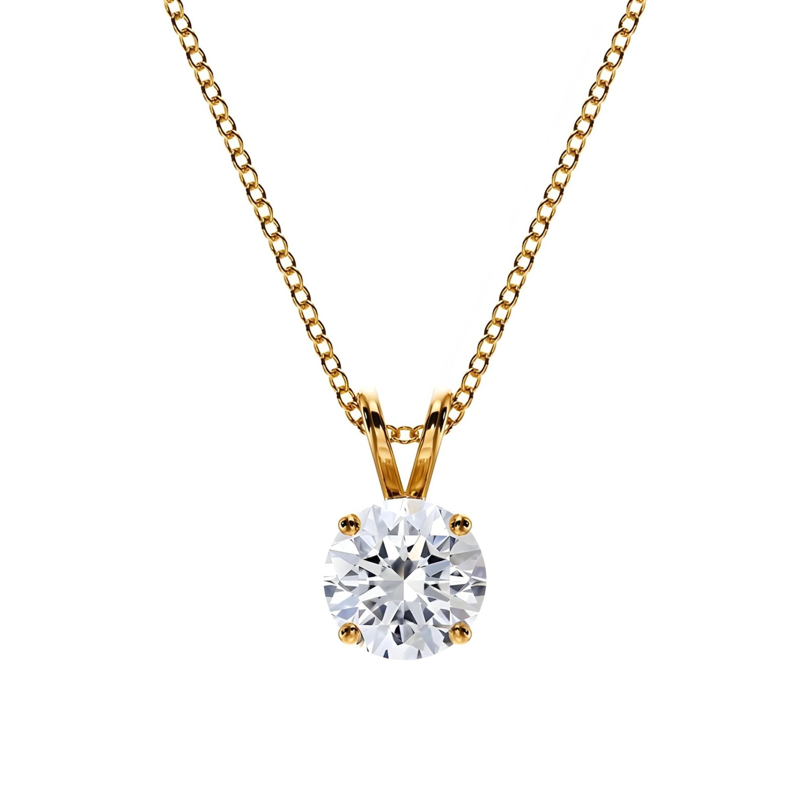 Classic 18K gold solitaire pendant with 1 CT E color, VS1 clarity round brilliant Lab Grown diamond in a 4-prong basket. IGI Certified.