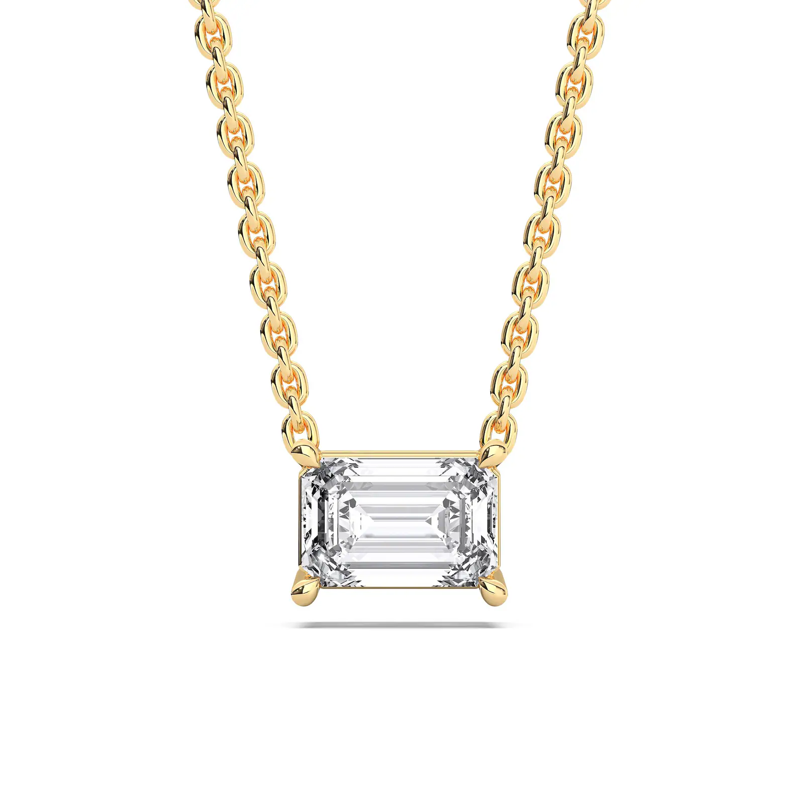 Crafted in solid 18K gold, the pendant hangs gracefully from a matching gold chain, combining durability with luxurious appeal. The emerald-cut diamond, with its clean lines and step-cut facets, creates a hall-of-mirrors effect that reflects light beautifully, while the solitaire setting keeps the focus on the center stone.