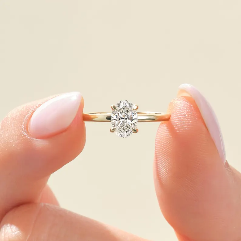 Celebrate love with timeless elegance through this 2.00 CT Oval Cut Lab Grown Diamond Hidden Halo Engagement Ring. The elongated oval-cut diamond delivers brilliance and a flattering shape, while the hidden halo detail adds a subtle sparkle beneath the center stone, enhancing its radiance without overpowering its classic solitaire appeal.