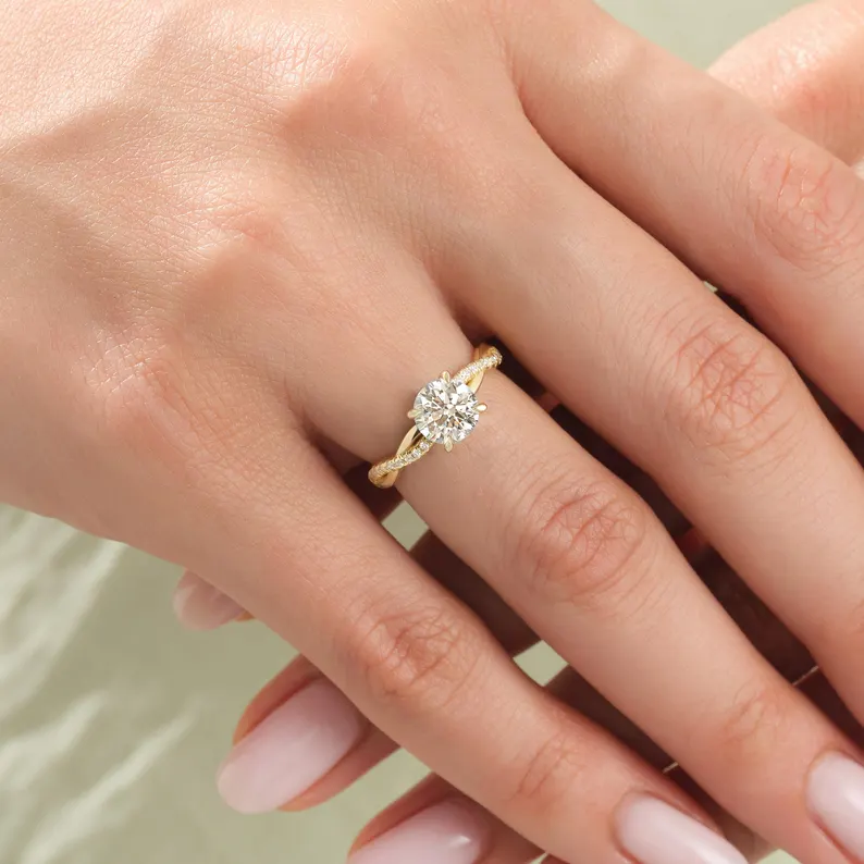 Make a statement of everlasting love with this 18K Solid Gold 2.00 CT Round Cut Twisted Natural Diamond Engagement Ring. The exquisite round-cut center diamond, known for its brilliance and fire, is beautifully complemented by a twisted band adorned with sidestones, adding a modern and elegant twist to the classic solitaire design.