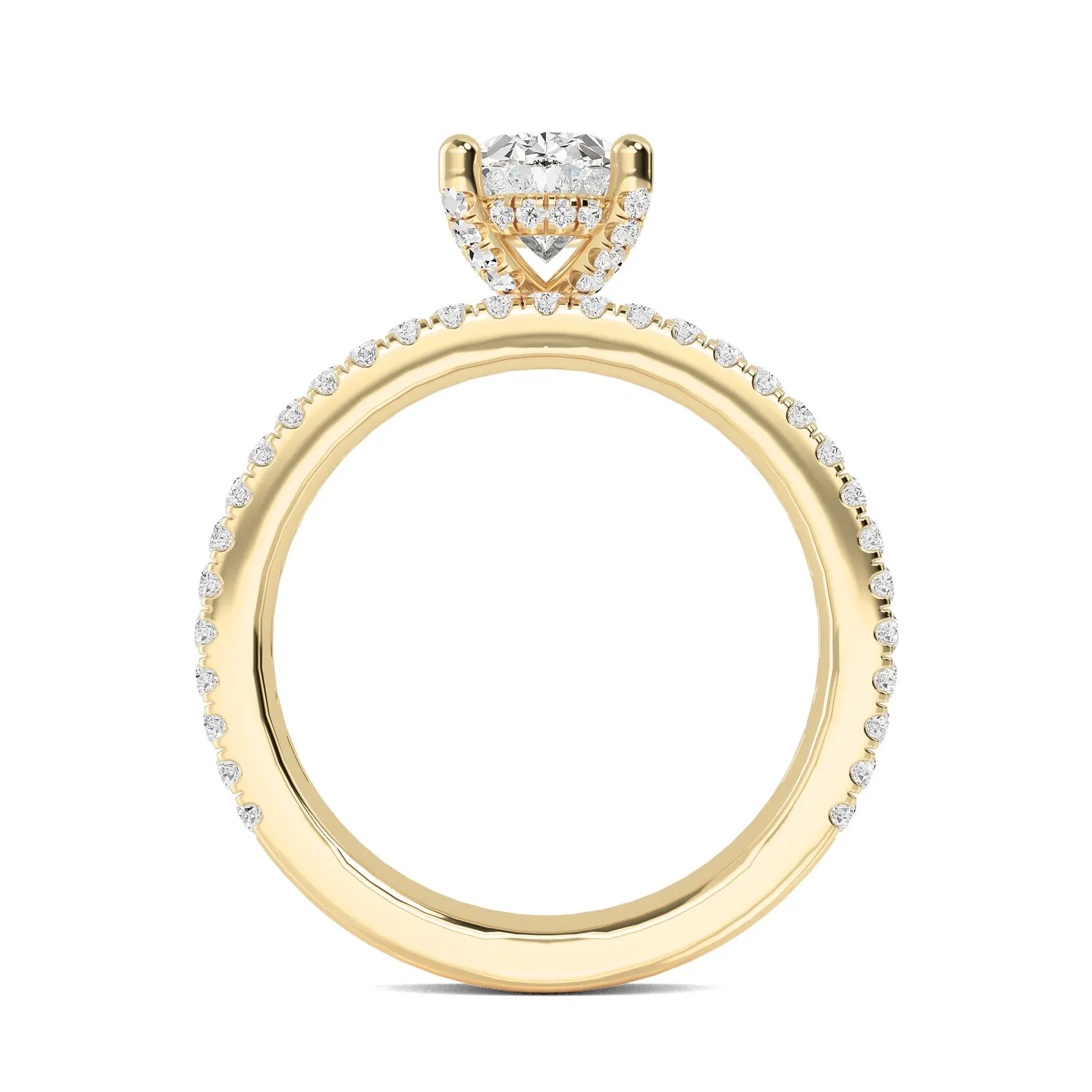 The split shank design, adorned with pave-set diamonds, enhances the center stone’s brilliance and creates an airy, elegant silhouette. Crafted in solid 18K gold, this ring is both durable and luxurious, ideal for daily wear while symbolizing everlasting love.