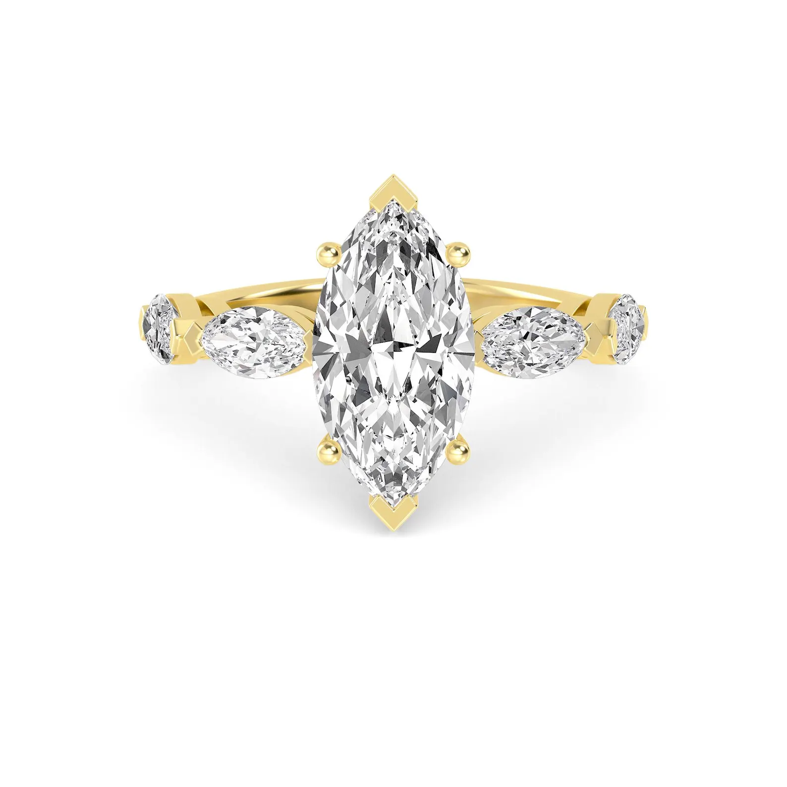 A dazzling 18K Solid Gold Engagement Ring featuring a 1.50-carat marquise-cut Lab Grown diamond, accented with additional marquise side stones totaling 2.33 carats. Certified by IGI, with E color and VS1 clarity for exceptional brilliance.