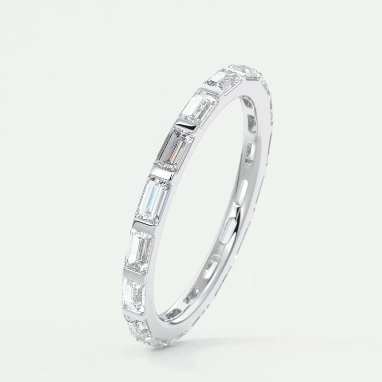 Elevate your style with the 18K Solid Gold 2.38 CT Natural Diamond Baguette Cut Bar Set Full Eternity Band, a masterpiece of elegance and sophistication. Handcrafted in 18K solid gold, this stunning eternity ring features a seamless circle of GIA-certified natural diamonds, each cut in a sleek 4×2 mm baguette shape for a refined, modern sparkle. The bar-set design securely holds each diamond in place while allowing maximum light to pass through, creating an exceptional radiance. With E color and VS1 clarity, every stone exudes brilliance and purity. GIA & BIS hallmarked to guarantee gold authenticity, this band is perfect as a wedding ring, anniversary gift, or a statement stacking piece.