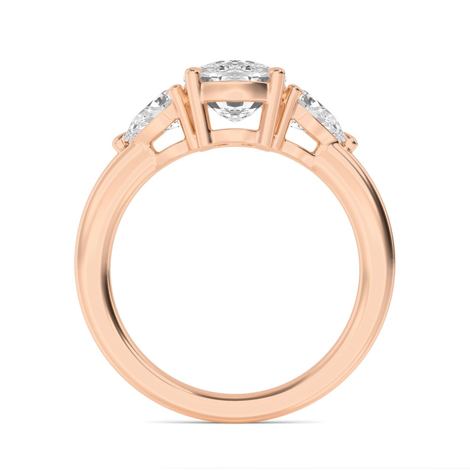 The centerpiece features a 2.00 carat cushion cut Lab Grown diamond, renowned for its romantic shape and brilliant sparkle. Flanked by two dazzling side diamonds, this design beautifully represents the past, present, and future of your love story.