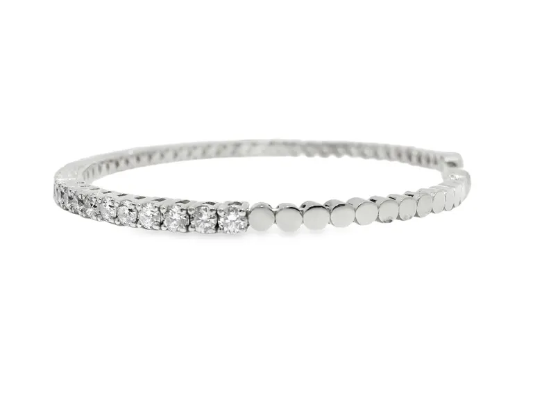 The diamonds are graded E color and VS1 clarity, delivering maximum sparkle with a responsible and sustainable origin. The bangle’s sleek, timeless design makes it ideal for special occasions or everyday luxury, whether worn solo or stacked with other pieces.
