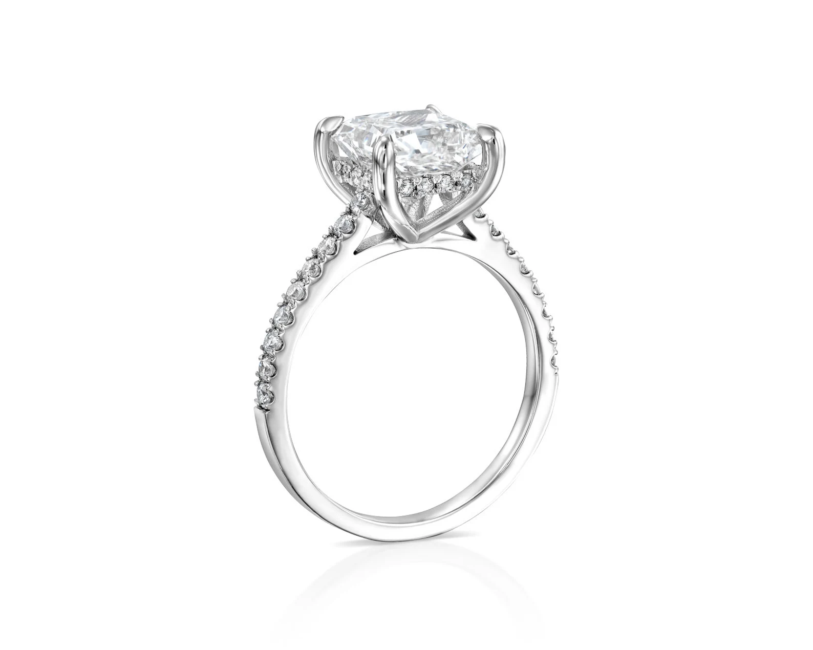 The sleek 1.65mm band enhances the modern charm of the center stone while offering a delicate frame of sparkle thanks to its classic pavé detailing. The four-prong setting ensures secure elegance.