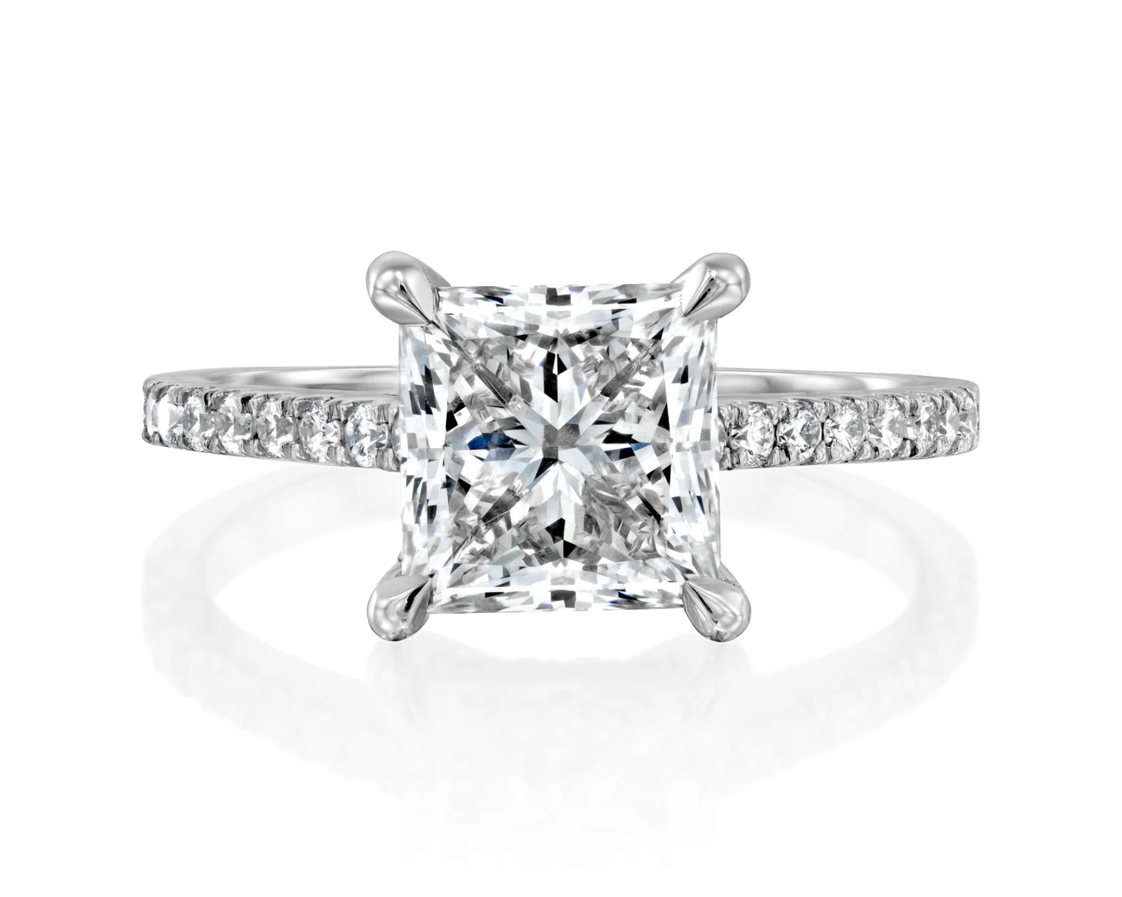 Celebrate your forever moment with this 2 carat Princess Cut Natural Diamond Engagement Ring, artfully set in 18K solid gold and adorned with pavé-set accent diamonds along the band. At its heart lies a GIA-certified princess cut diamond, weighing a stunning 2.00 carats, with excellent G color and VS2 clarity—exuding exceptional brilliance and fire.