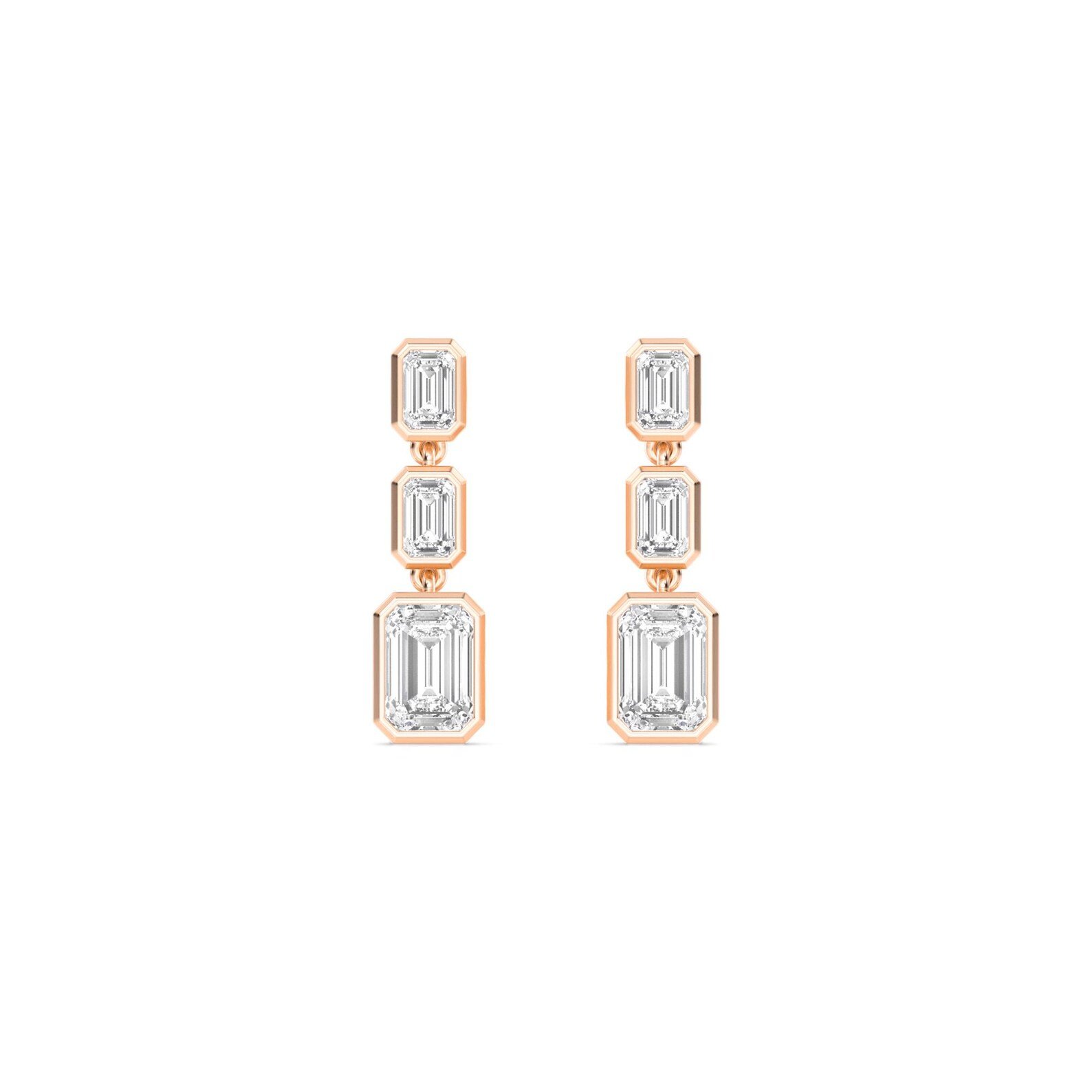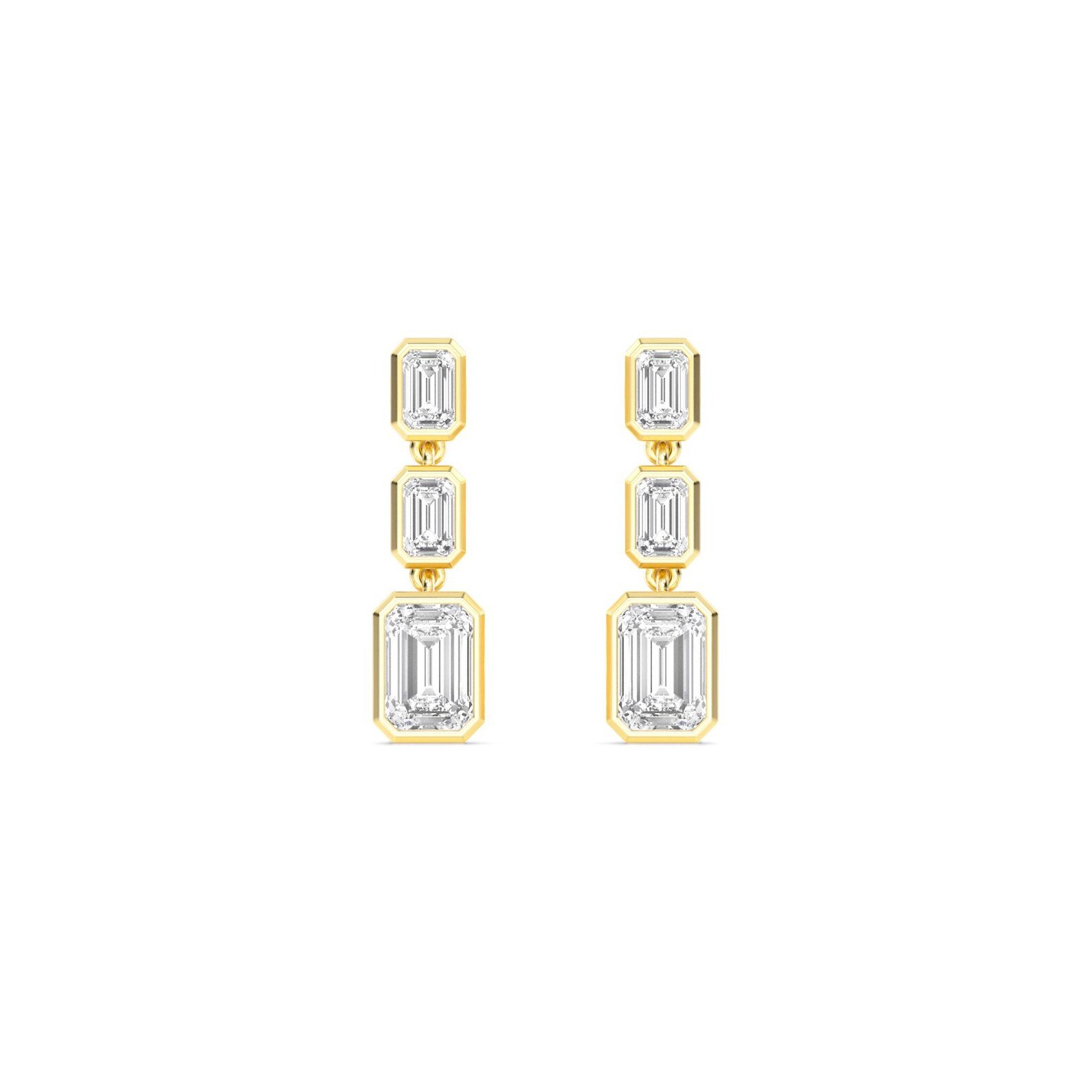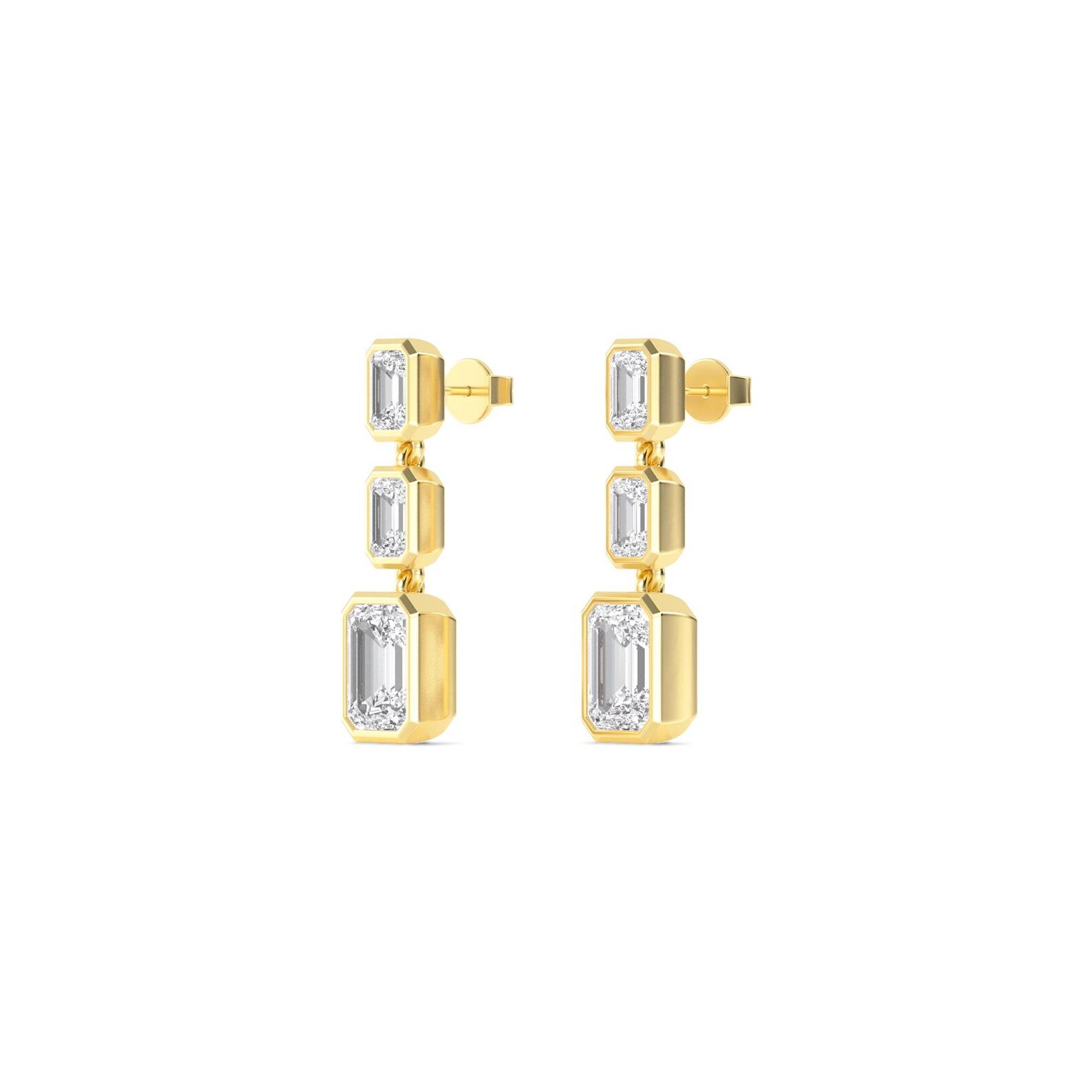 Radiating sophistication with clean lines and timeless elegance, these 3.15 carat Lab Grown diamond drop earrings are a striking addition to any fine jewelry collection. Handcrafted in 18K solid gold, each earring features a vertical bezel-set arrangement of three dazzling emerald cut diamonds, creating a sleek and modern silhouette that gracefully elongates the ear.