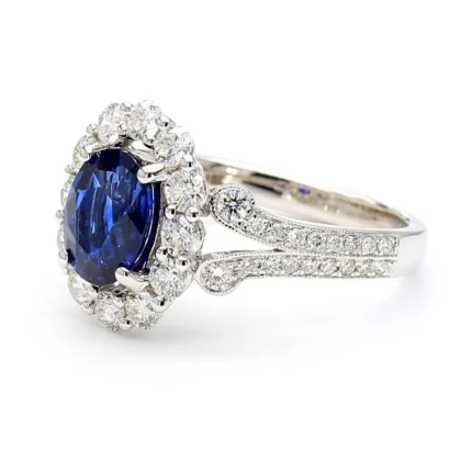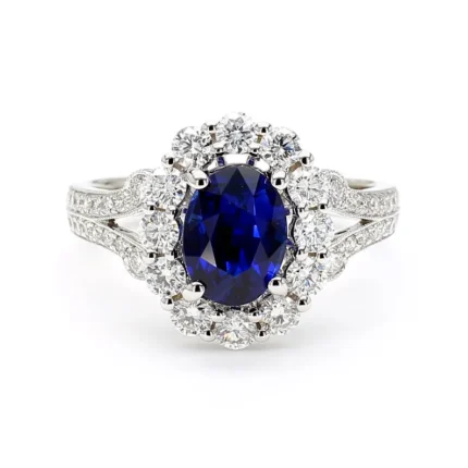 Surrounding the sapphire are dazzling lab grown round white diamonds in mixed sizes — from 0.89 to 2.69 mm, and 3.0 – 3.25 x 1.80 – 2.05 mm — carefully arranged to enhance sparkle and dimension. Together, the gemstones total an impressive 2.52 carats, offering elegance with a modern edge.