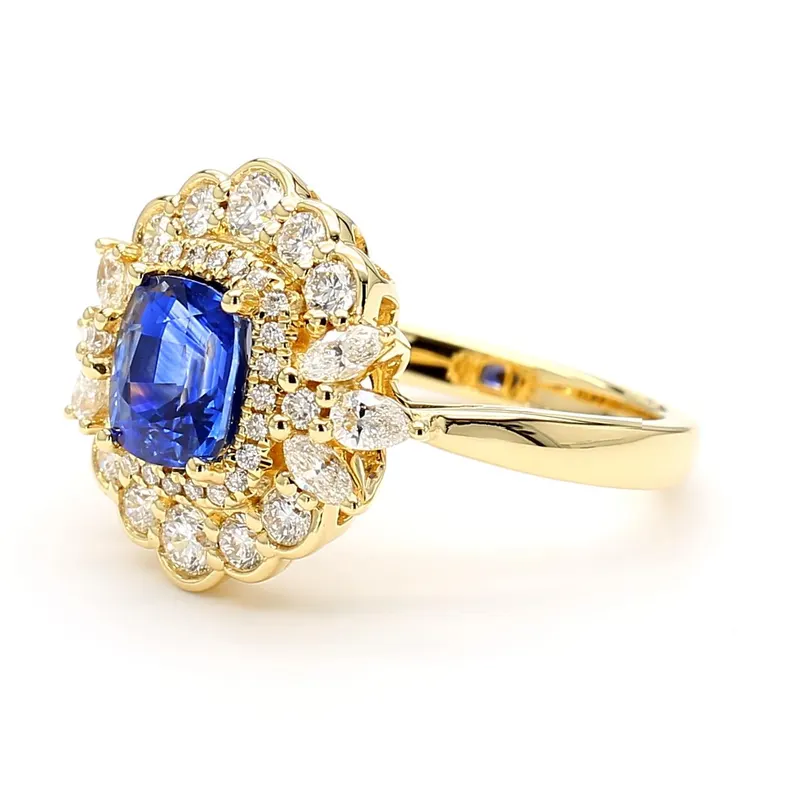 Make a bold yet refined statement with this exquisite 18K Solid Gold Cocktail Ring, showcasing a luxurious combination of deep color and radiant brilliance. At the heart of the ring is a stunning cushion-cut blue sapphire, measuring 6.7 x 5.7 mm, known for its regal hue and timeless charm.