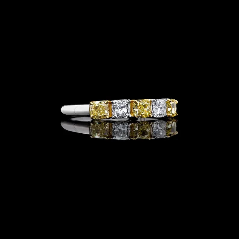 1.04ct cushion-cut lab grown yellow & white diamond band in 18K gold. Elegant, certified, and sustainably crafted
