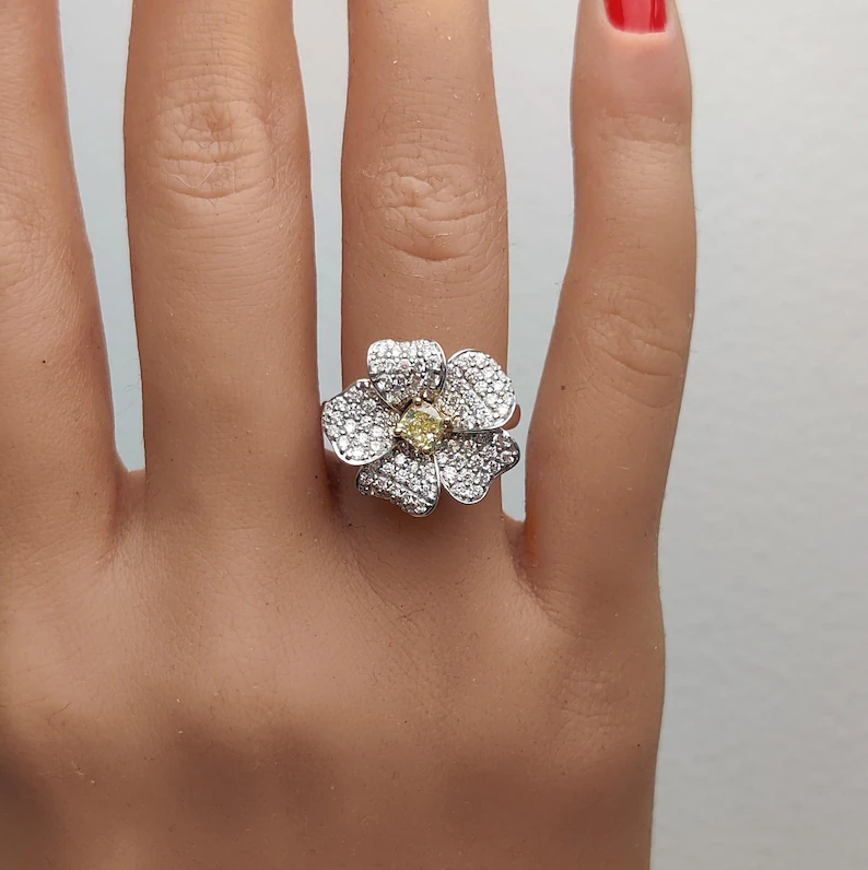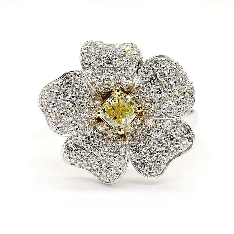 Celebrate radiant elegance with this 1.31 Carat Lab Grown Yellow Diamond Cocktail Ring, set in luxurious 18K solid gold. At the heart of this design is a stunning cushion cut lab grown yellow diamond (3.9 x 3.9 mm), glowing with soft golden hues that capture light from every angle.