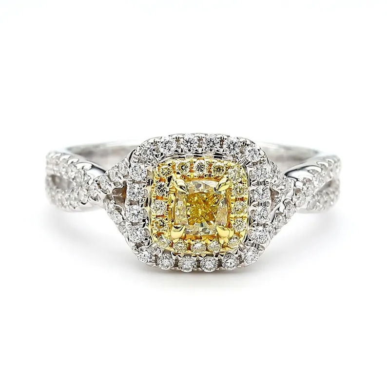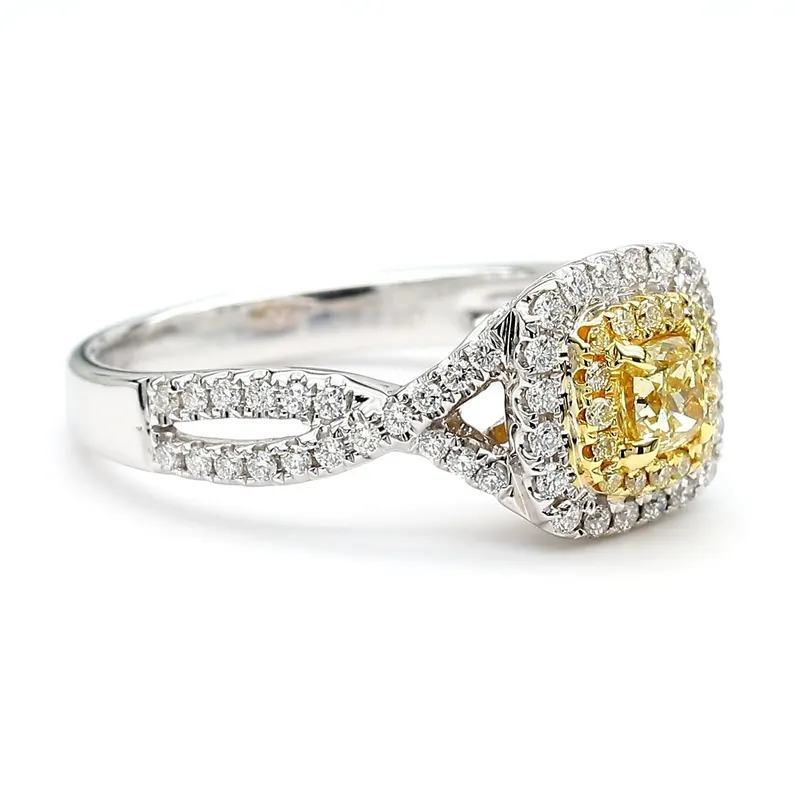 A radiant 0.69 carat cocktail ring featuring a cushion-cut yellow Natural diamond, set in luminous 18K solid gold and accented with round yellow and white diamonds.
