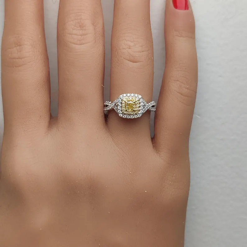 Make a bold yet graceful statement with our 18K Solid Gold Cushion Natural Yellow Diamond 0.69 Carat Cocktail Ring. Designed for those who appreciate fine craftsmanship and radiant color, this ring showcases a vibrant cushion-cut yellow Natural diamond that captures light with every movement.
