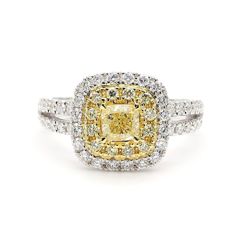1.23ct cocktail ring with cushion yellow Natural diamond in 18K gold, accented with yellow & white round diamonds.